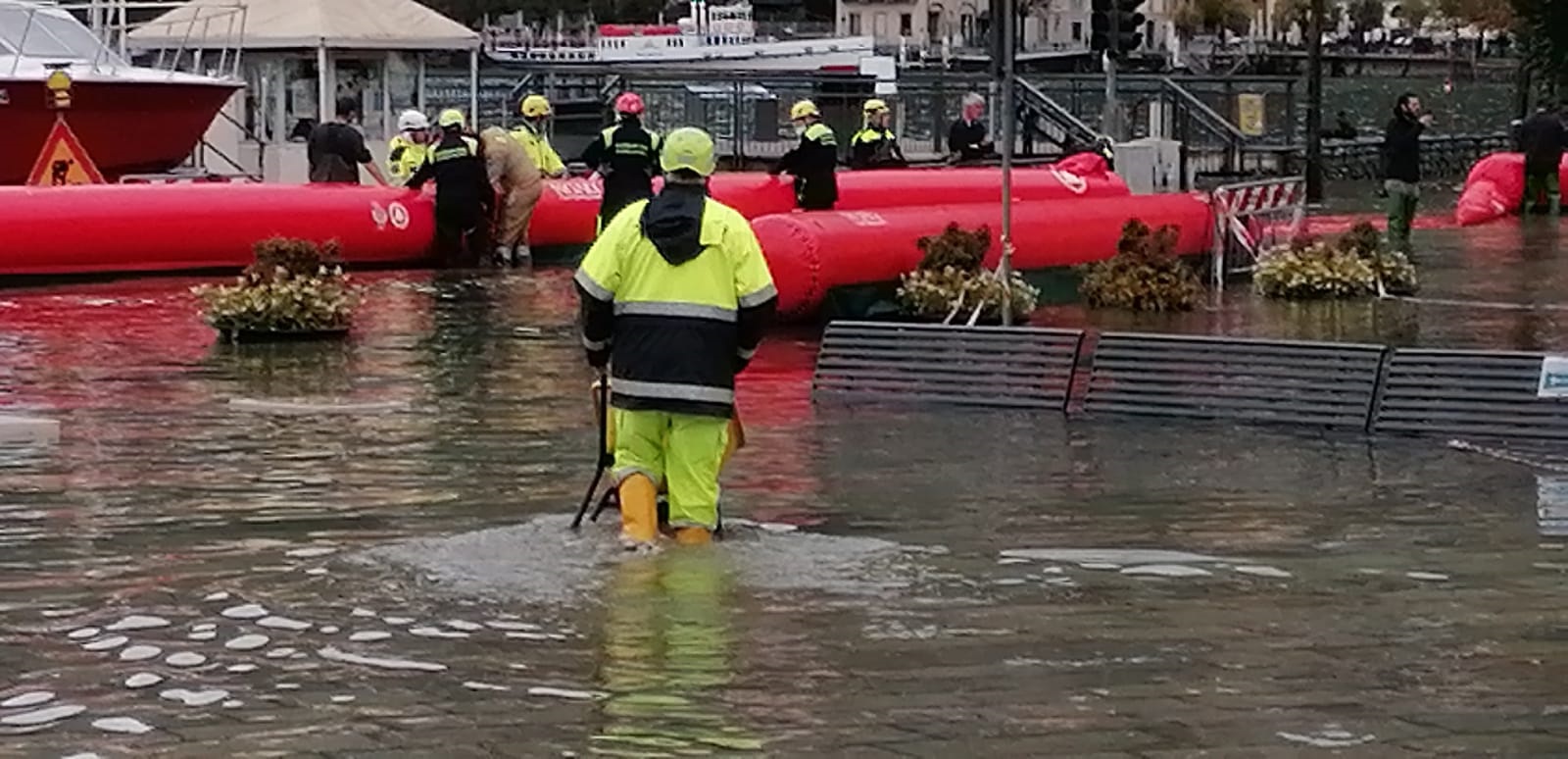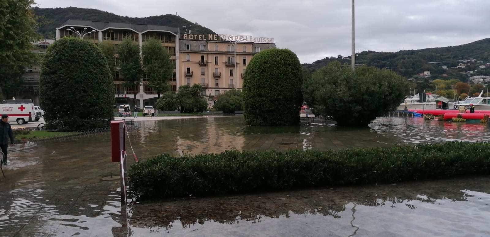 Le immagini che ritraggono la situazione di piazza Cavour attorno alle 10.30 di oggi, 5 ottobre, danno la sensazione della “Caporetto” per il sistema di protezioni collocate davanti al lago e per la gigantesca idrovora collocata ieri per pompare via l’acqua.