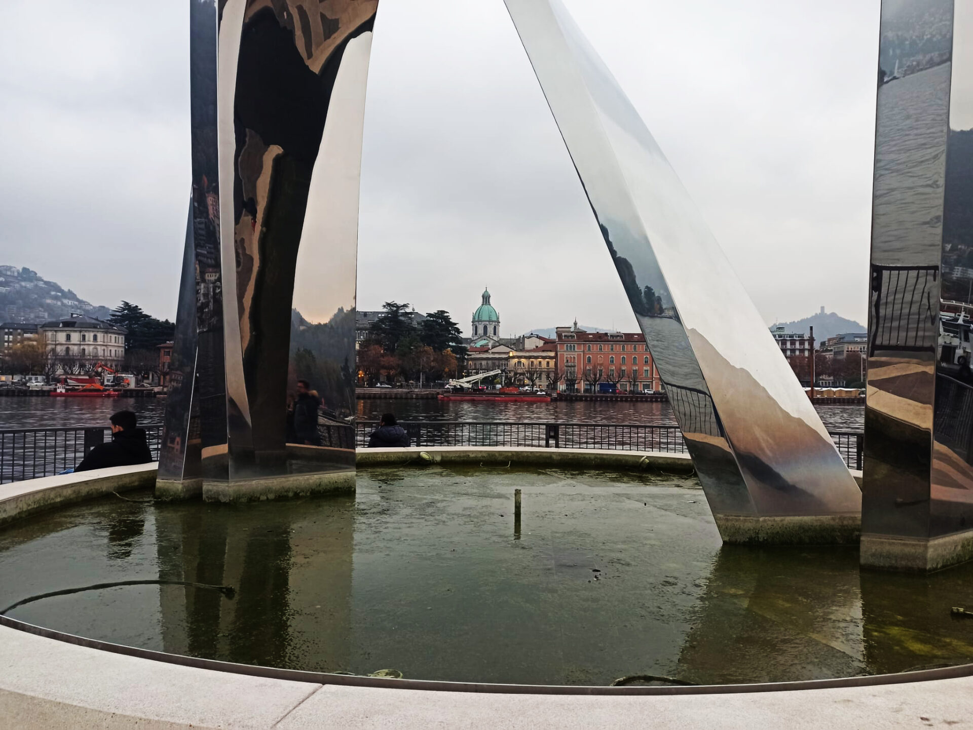 Allo specchio d’acqua che faceva da controriflesso all’acciaio della scultura ora si sono sostituite alghe marcescenti e putridume vario, come da gallery sfogliabile: