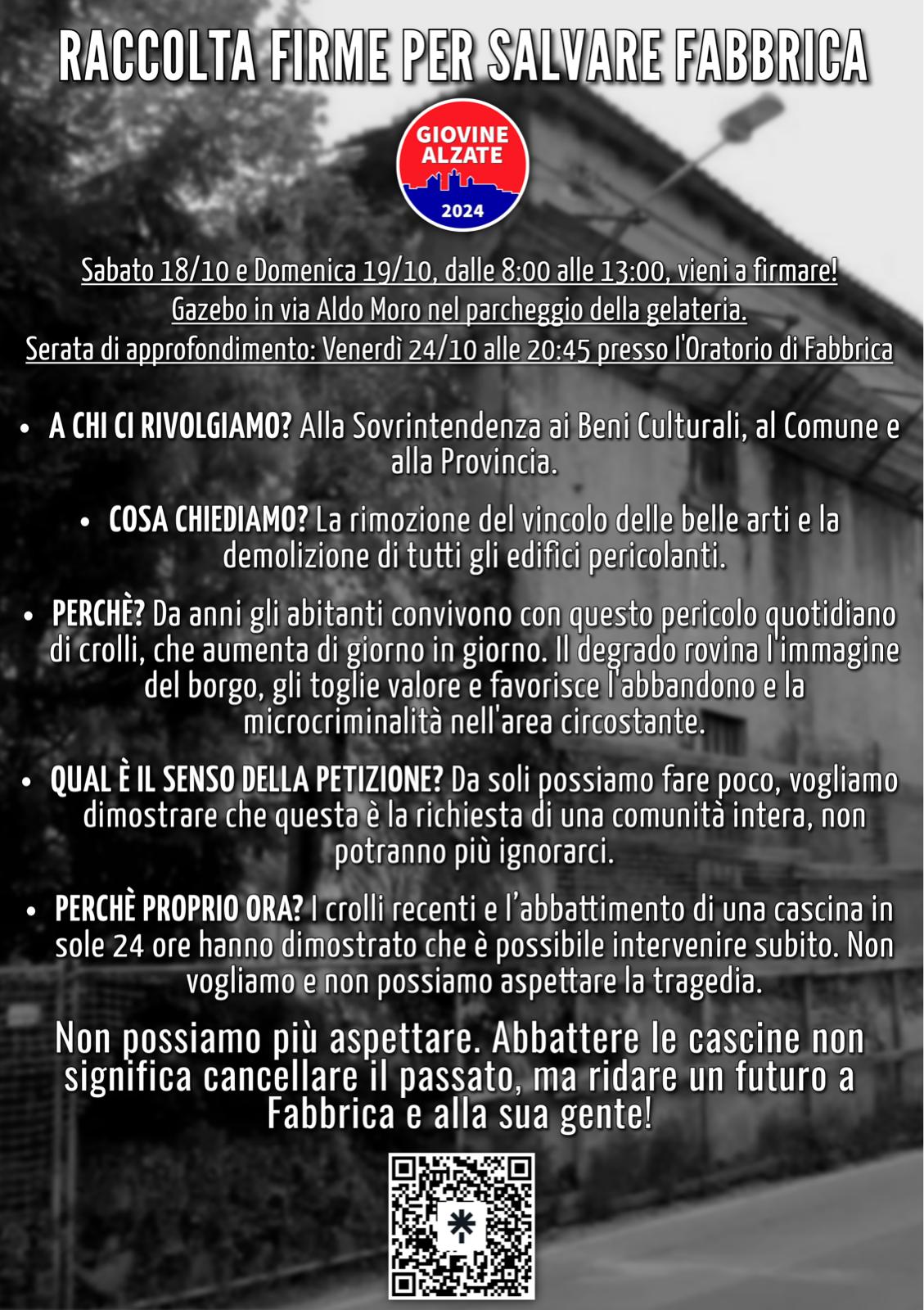 Sabato 18 ottobre e domenica 19 ottobre, dalle 8:00 alle 13:00, sarà possibile firmare la petizione, dal momento che saremo presenti con un gazebo in via Aldo Moro, nel parcheggio della gelateria. Venerdì 24 ottobre, alle 20:45, si terrà una serata pubblica di approfondimento presso l’Oratorio di Fabbrica, dove esporremo concretamente la proposta e spiegheremo meglio la “questione Fabbrica”. Saranno presenti e interverranno l’architetto Mattia Pedrini, il dottor Alberto Roncoroni e il consigliere Valerio Colombo, collaboratori nell’ideare e promuovere la petizione.