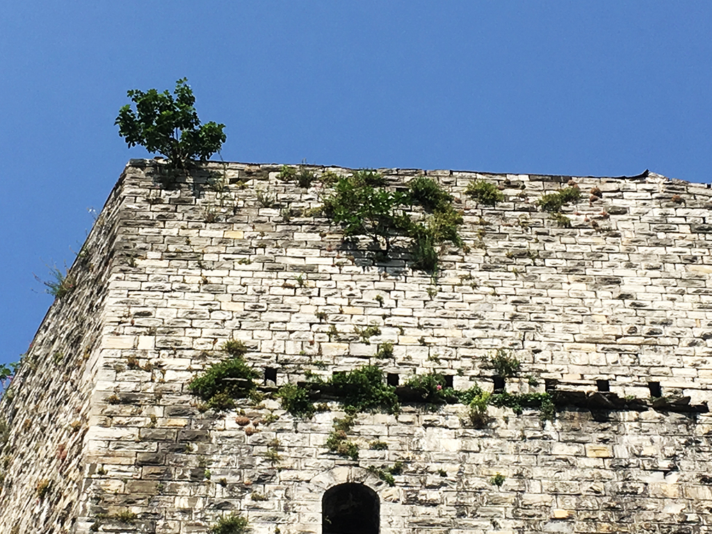 Infine, ultimi ma non ultimi, gli alberi. Crescono indisturbati da anni, a giudicare dalle dimensioni, tra le pietre delle mura, in cima alle torri, lungo i camminamenti, tanto per dire.