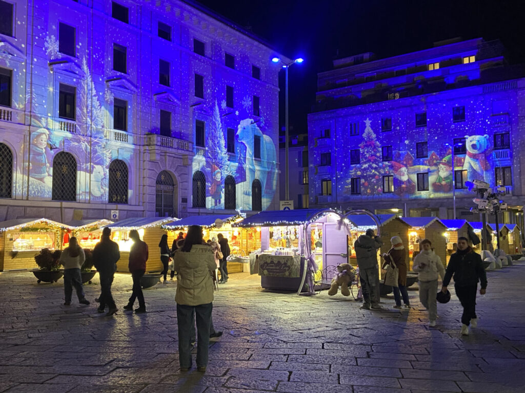 Per valorizzare l’evento, è stata pensata una scenografia con un’artistica proiezione architetturale sulla facciata della ex Banca d’Italia e sugli edifici circostanti, un bosco con personaggi natalizi che fa da cornice alle casette presenti nella piazza.