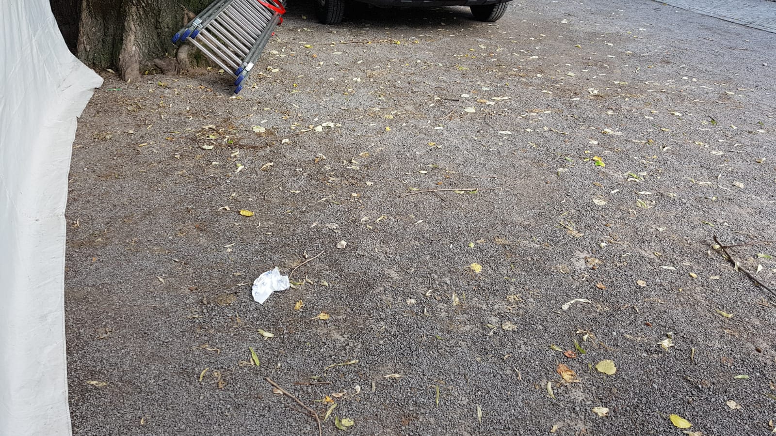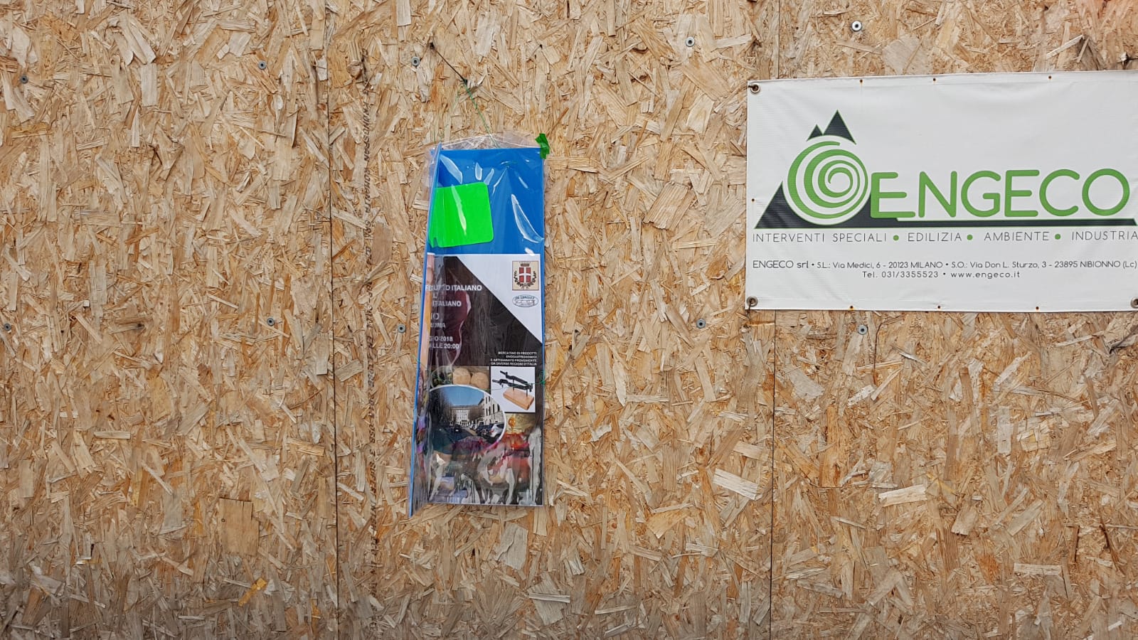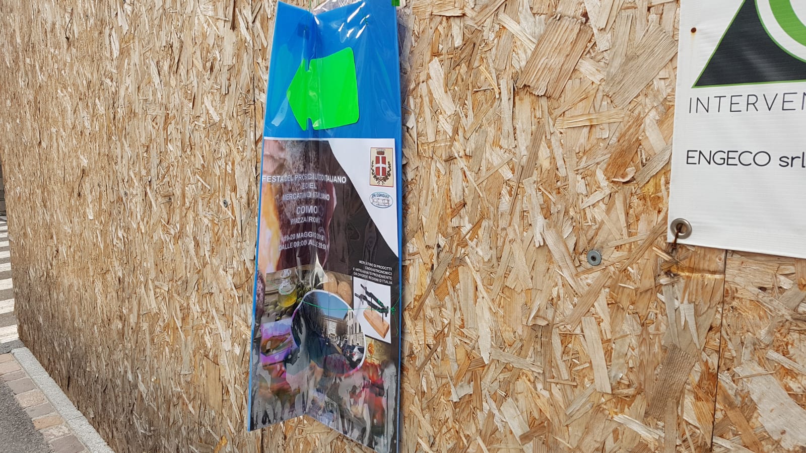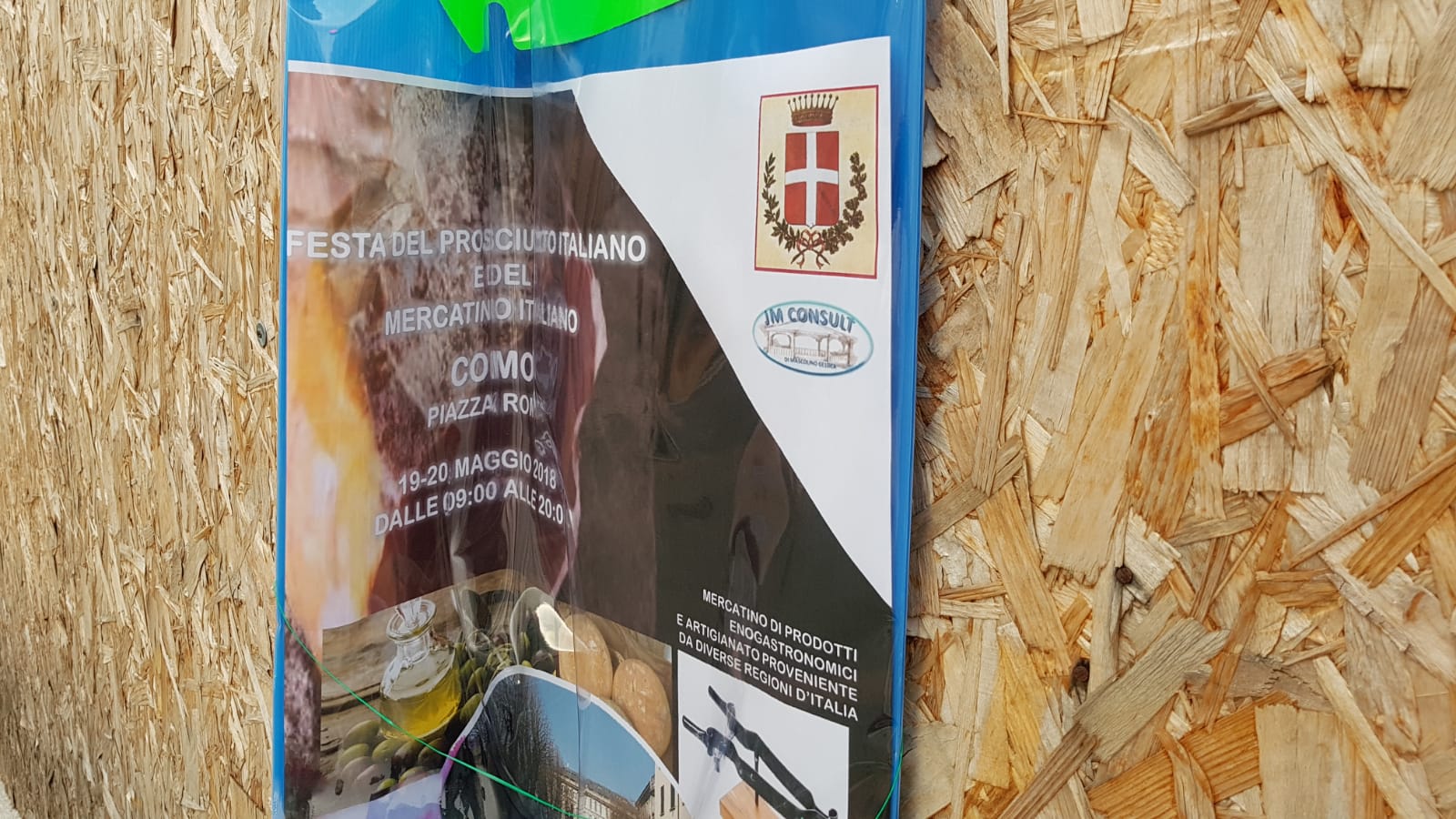 Il destino della “Festa del prosciutto italiano e del mercatino italiano” sembra essere vaticinato in un cartello semiaccartocciato a pochi metri dall’evento, in via Rodari.