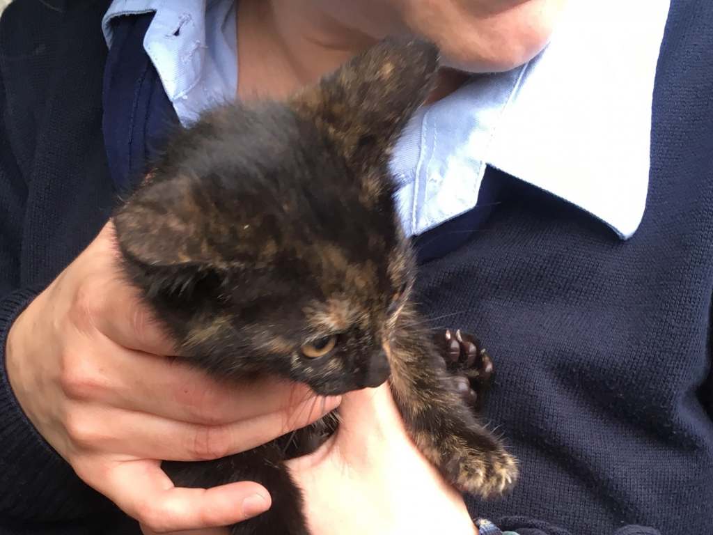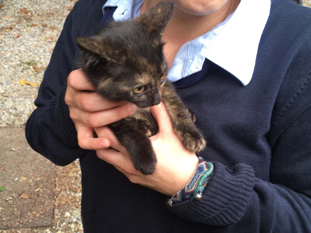 Pomeriggio movimentato (a lieto fine) per una gattina di pochissimi mesi, evidentemente abbandonata, che oggi ha pensato di mettere a dura una delle proverbiali sette vite salendo su un albero di viale Cavallotti, accanto alla sede di Giurisprudenza dell’Università dell’Insubria.
