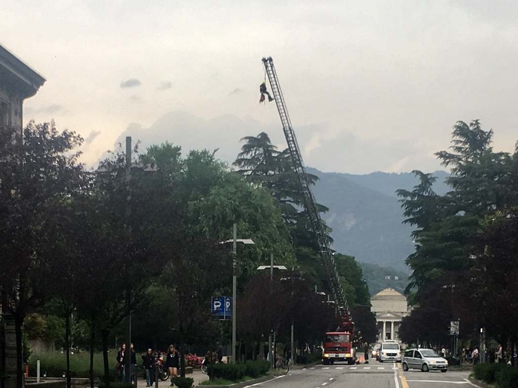 Non riuscendo più a scendere, e spaventata dall’altezza davvero notevole cui si era spinta, la micina ha attirato con i suoi miagolii una dipendente dell’Università che ha chiamato i Vigli del Fuoco, arrivati in pochi minuti con un’autoscala.