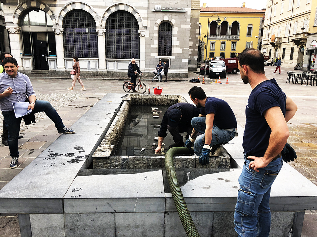Dopo mesi di segnalazioni e denunce oggi primi movimenti in piazza Grimoldi. Le fontane della piazza da tempo presentavano grossi problemi. Dapprima svuotate per evitare il contraccolpo delle settimane di gelo circa un mese fa sono ripartite, a singhiozzo, senza che alcune manutenzione fosse effettuata. Presto si sono trasformate in due stagni di acqua semiputrida con un timido zampillo involontario in una delle due.