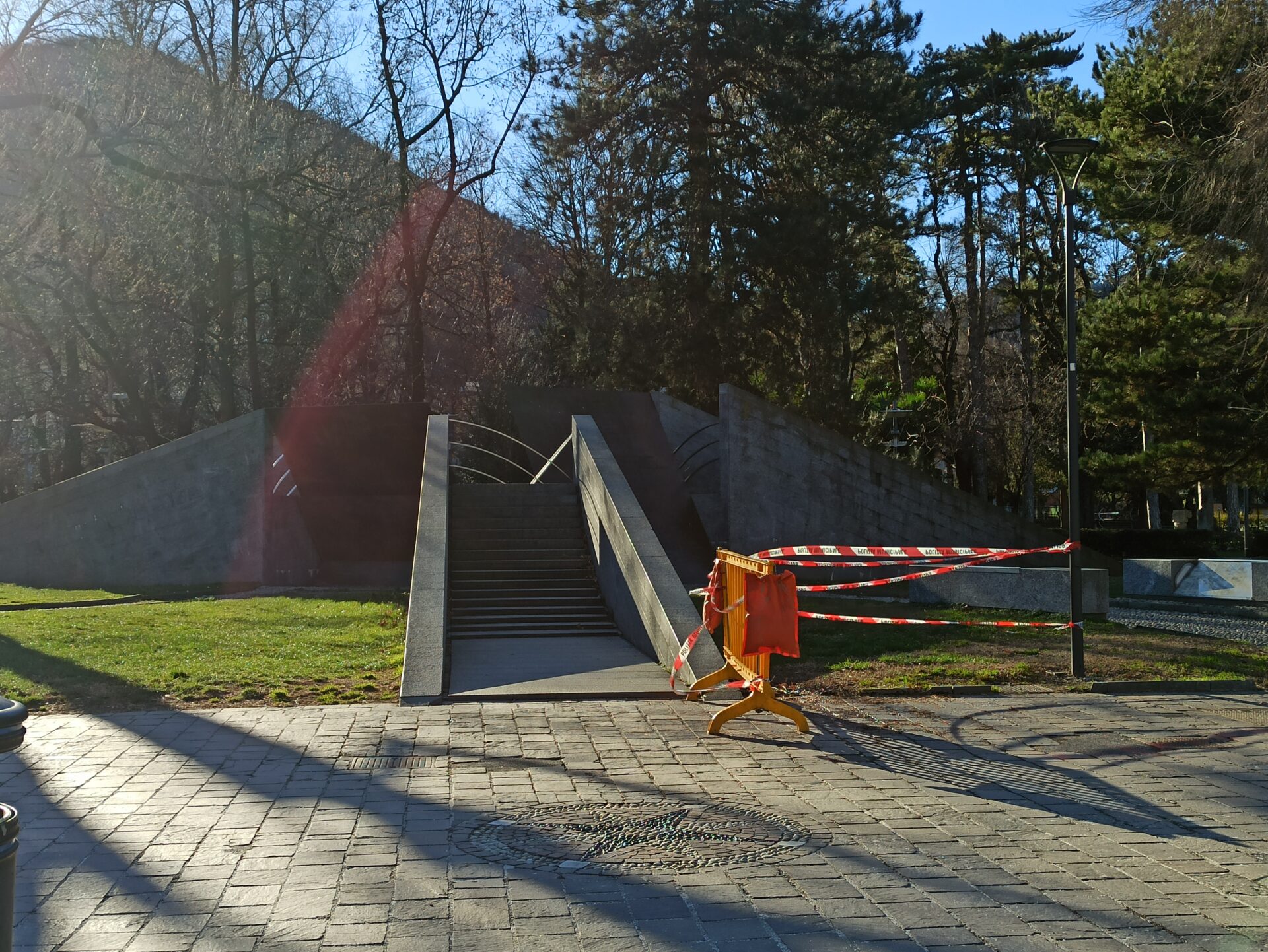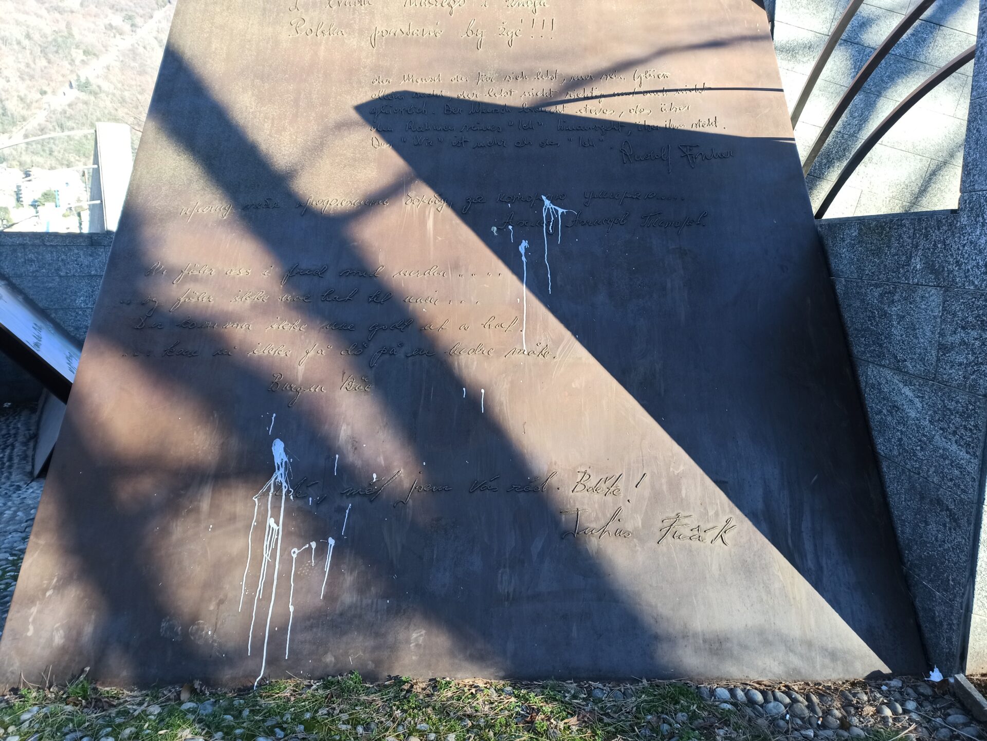 La situazione è oltre il vergognoso: escrementi di uccelli a imbrattare le grandi lastre che riportano stralci delle lettere dei condannati a morte nel secondo conflitto mondiale, le lastre di granito bianco con i messaggi di cordoglio di diciotto paesi per le vittime del nazismo annerite e illeggibili e una transenna con un lungo nastro da cantiere bianco e rosso a delimitare un tratto di marciapiedi.