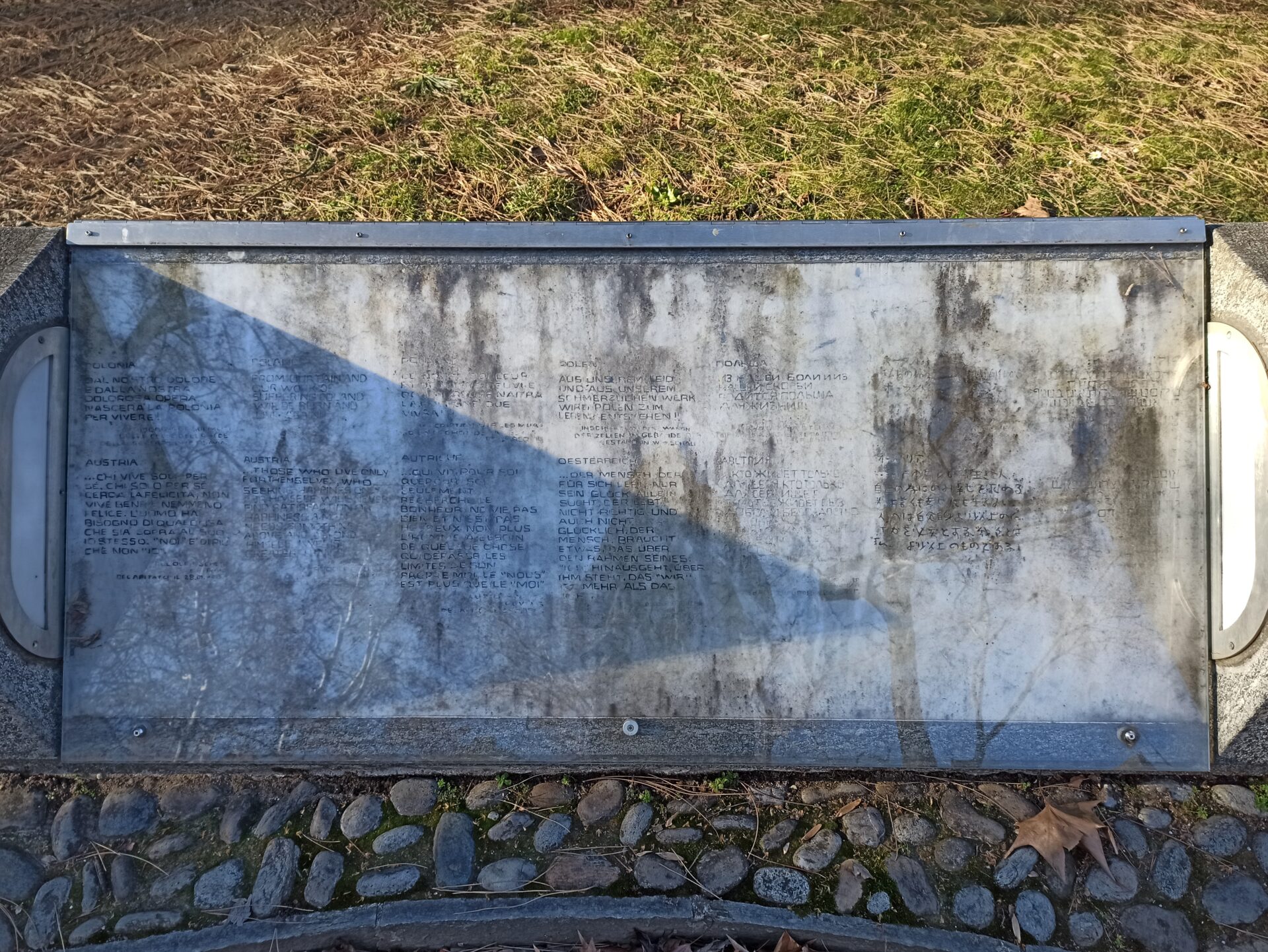 E a fianco di ogni lastra (seconda foto), vi sono le traduzioni in sette lingue, delle frasi dei condannati a morte; ma ormai illeggibili! Chissà se per il 25 aprile o il 6 agosto qualcuno interverrà per evitare alla città anche questa ulteriore vergogna