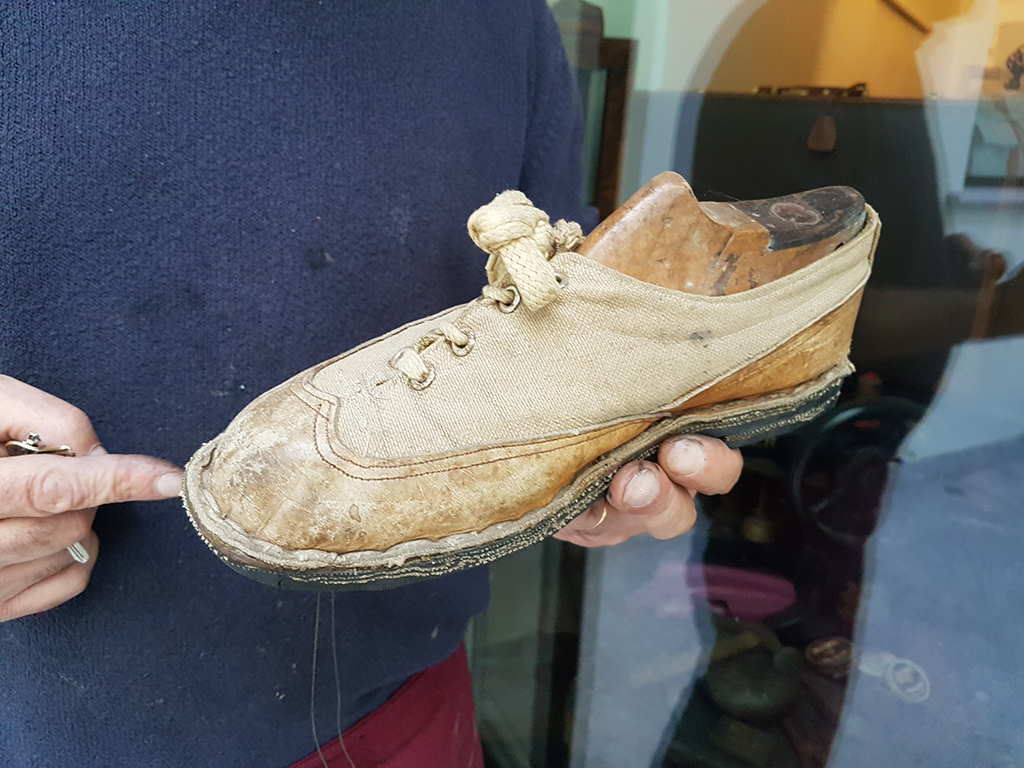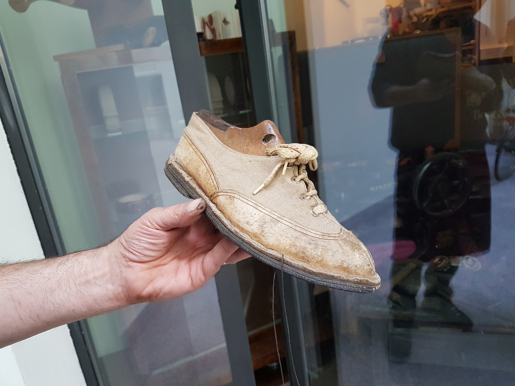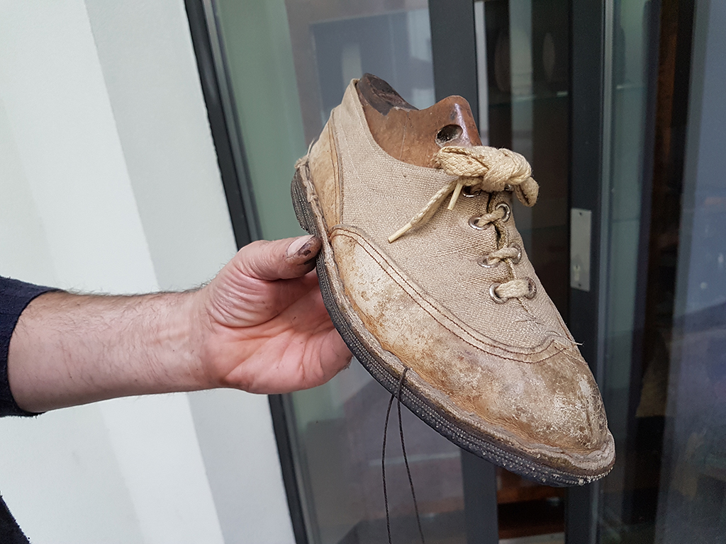 “Guarda bene, questa è roba di prima categoria. La tela è presa da un sacco di juta del caffé, la suola è uno pneumatico. Le ha fatte mio padre, durante la guerra: sono un capolavoro, altro che plastica”.
