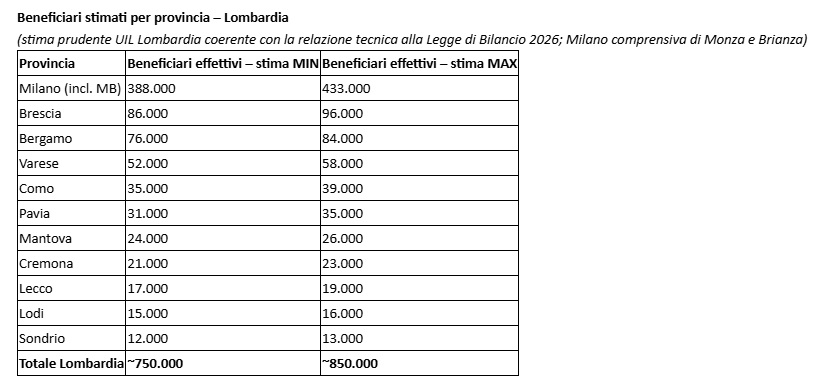 In coerenza con la relazione tecnica alla Legge di Bilancio 2026, che stima in circa 3,8 milioni i beneficiari a livello nazionale, una valutazione prudente colloca in Lombardia l’effettiva platea dei beneficiari della misura in una forbice compresa tra 750.000 e 850.000 lavoratrici e lavoratori, pari al 23% dei lavoratori del settore privato, che hanno visto rinnovato il CCNL tra il 2024-2025.