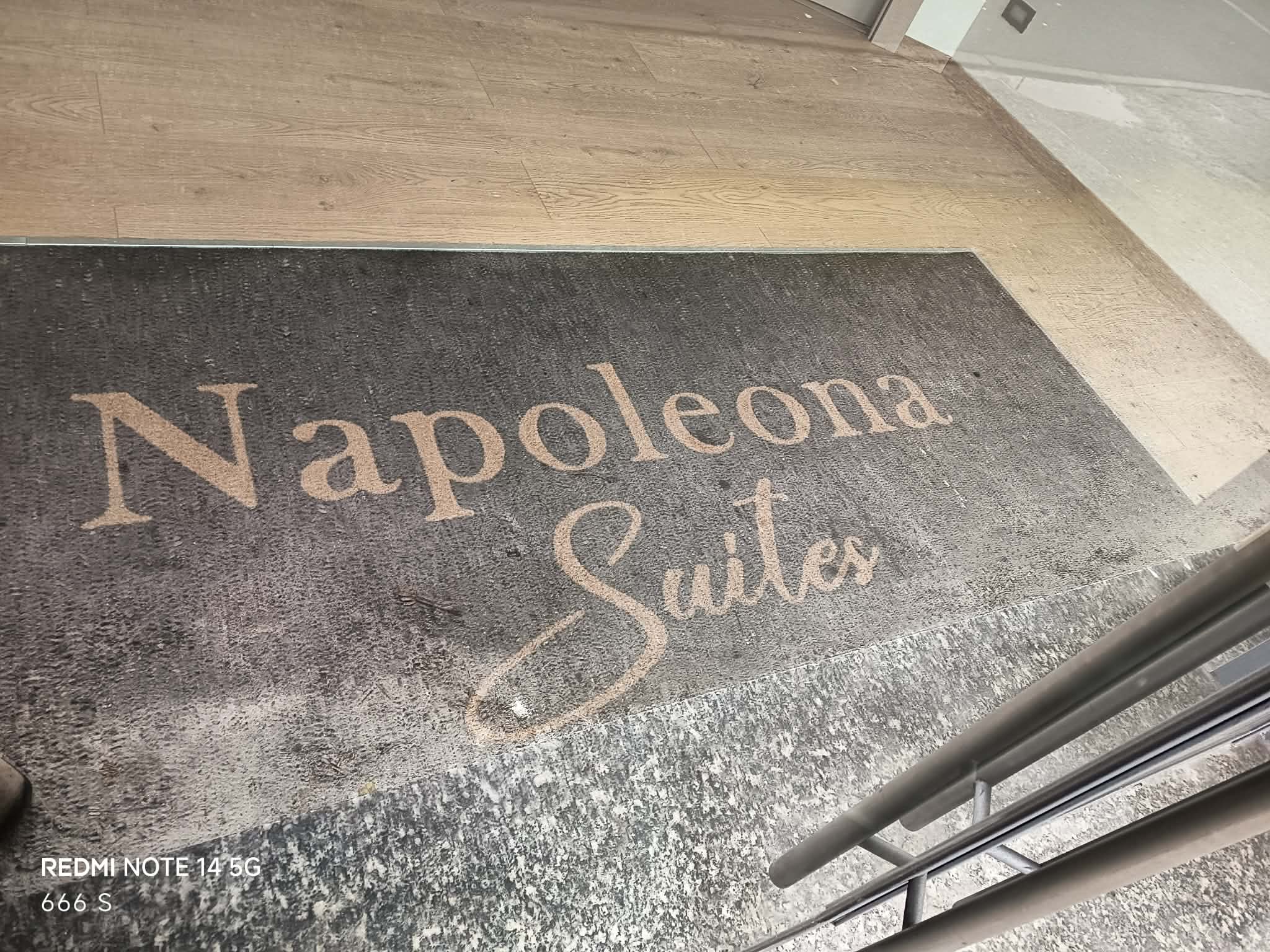 Al centro, la porta di ingresso per quegli stessi locali. Ma soprattutto, a colpire è il benvenuto che si legge nitidamente sul tappetto appena dietro l’ingresso: “Napoleona Suites”, denominazione che ha chiaramente un’ambizione un po’ superiore rispetto alla più semplice accoglienza.