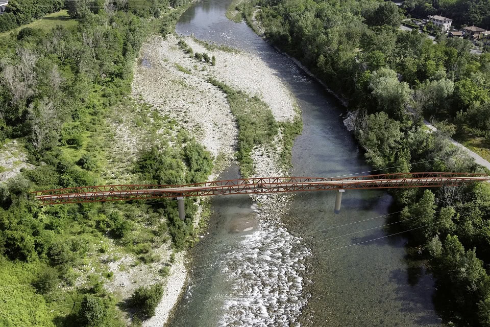 Sotto il profilo architettonico, la passerella sarà composta da tre campate reticolari ad arco, sostenute da due spalle laterali e due pile posizionate nell’alveo del fiume. Per quanto riguarda i materiali, si è optato per l’acciaio corten, una scelta tecnica mirata a garantire una perfetta integrazione ambientale e un’armonia cromatica con il paesaggio naturale del fiume Brembo.