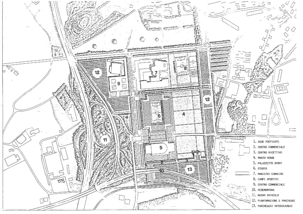 E così ecco lo stadio per il calcio professionistico, sì, ma anche campi sportivi all’aperto, un palazzetto dello sport, un centro commerciale, un albergo, parcheggi di interscambio e aree verdi in grado di vivere 365 giorni l’anno. Forse troppo per quegli anni, ma per oggi?