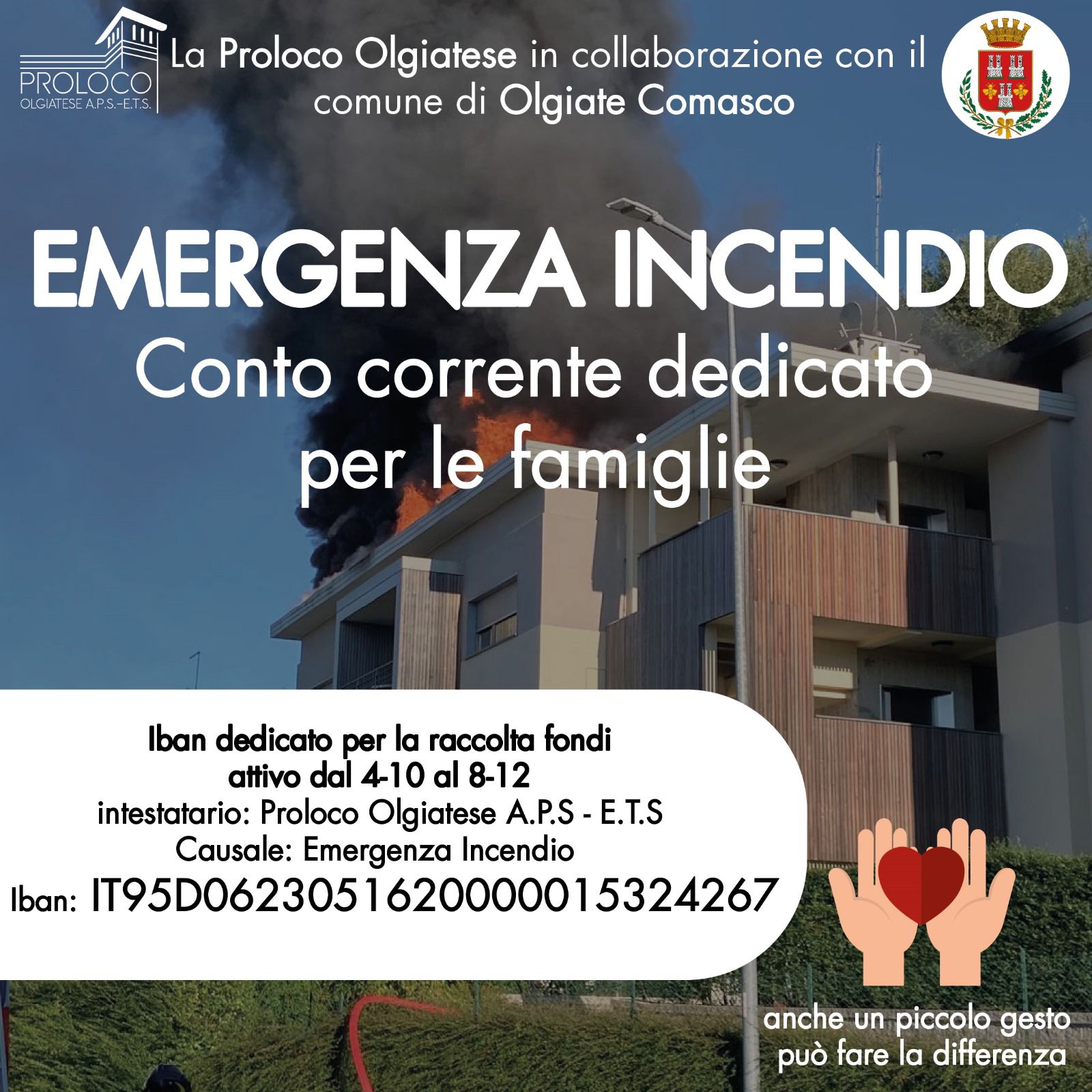 Grazie alla disponibilità subito messa in campo dalla PRO LOCO OLGIATESE che ringrazio di cuore, in stretta collaborazione con il COMUNE di OLGIATE COMASCO in qualità di garante, è stato aperto il CONTO CORRENTE DEDICATO presso la banca Crédit Agricole di Olgiate per aiutare le 9 FAMIGLIE che hanno subito i danni e sono fuori casa a causa dell’incendio scoppiato nella giornata di LUNEDI 29 SETTEMBRE.