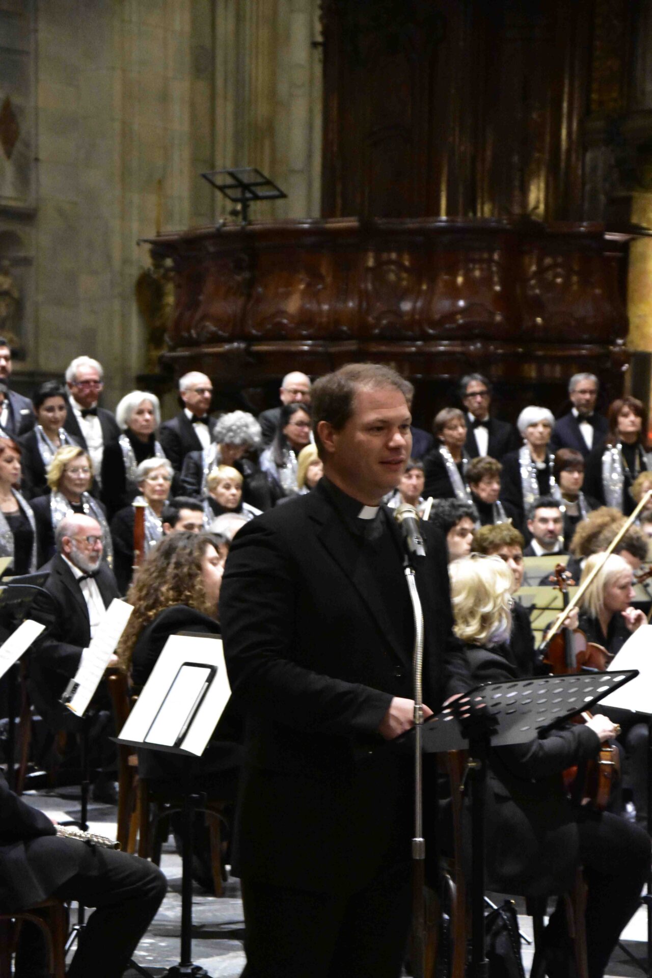 Prima dell’inizio del concerto, la dottoressa Anna Rossi, presidente del Centro Culturale Paolo IV, organizzatore dell’evento in occasione del periodo di quaresima, ha accolto calorosamente interpreti e pubblico esprimendo gratitudine per l’impegno ed il sostegno nei confronti dell’iniziativa. Don Nicholas Negrini, maestro di cappella della cattedrale, ha introdotto il pubblico all’ascolto delle opere chiedendo silenzio e meditazione fino alla fine del concerto, quando tutte le campane della cattedrale hanno suonato a festa per alcuni minuti, segnando simbolicamente l’appello di Dio per la pace al mondo intero.