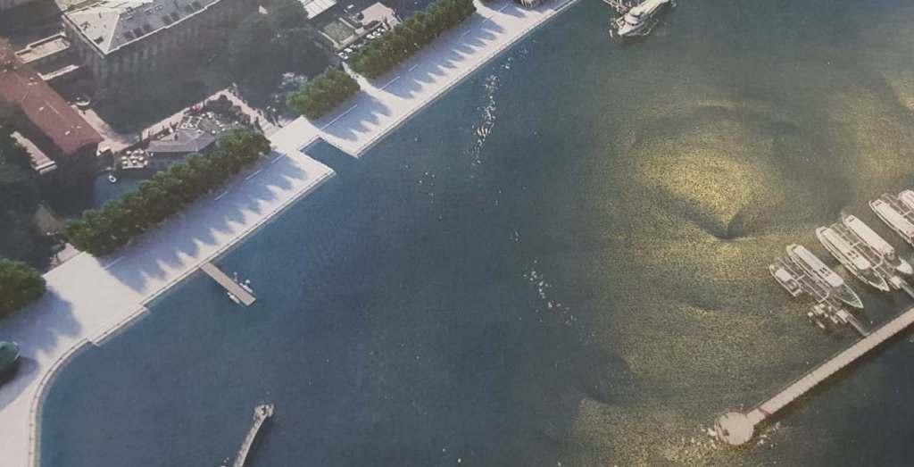 Sul fronte estetico il progetto Lucini prevedeva lastroni di granito, presenti sotto l’asfalto del lungolago, darsena con ponticello, panchine, pergolati e percorsi.