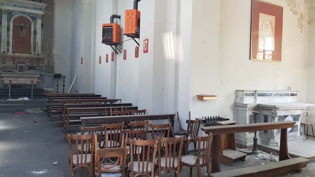 Mura scrostate, calcinacci dappertutto, vetri rotti, sedie malamente accatastate, polveri e frammenti di intonaco su altare e pavimenti, muffe, stracci dappertutto, altari di marmo ridotti a pattumiere.