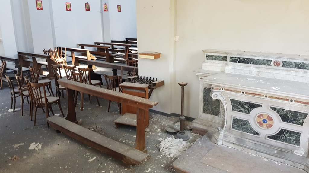 L’interno di quello che a tutt’oggi è un edificio sacro e sotto cui riposano circa 600 caduti della Prima Guerra Mondiale è uno sfacelo assoluto.