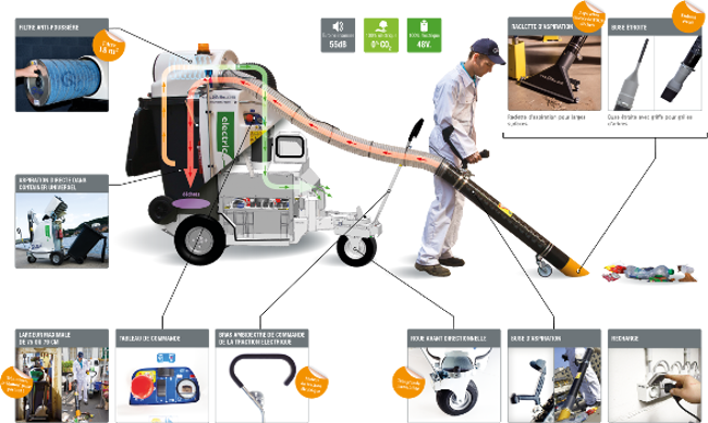 Dotato di tubo di 125 mm è in grado di risucchiare carta, cartone, pacchetti di sigarette e mozziconi, lattine e bottiglie in vetro, plastica o metallo, escrementi di animali, foglie secche, rifiuti incastrati nelle siepi alberate, residui di potatura, trucioli. Inoltre può intervenire quando è impossibile, o quasi, raggiungere con le scope marciapiedi, strade, spazi pubblici, area mercato, parcheggi, moli, stazioni, zone alberate, radici di alberi.