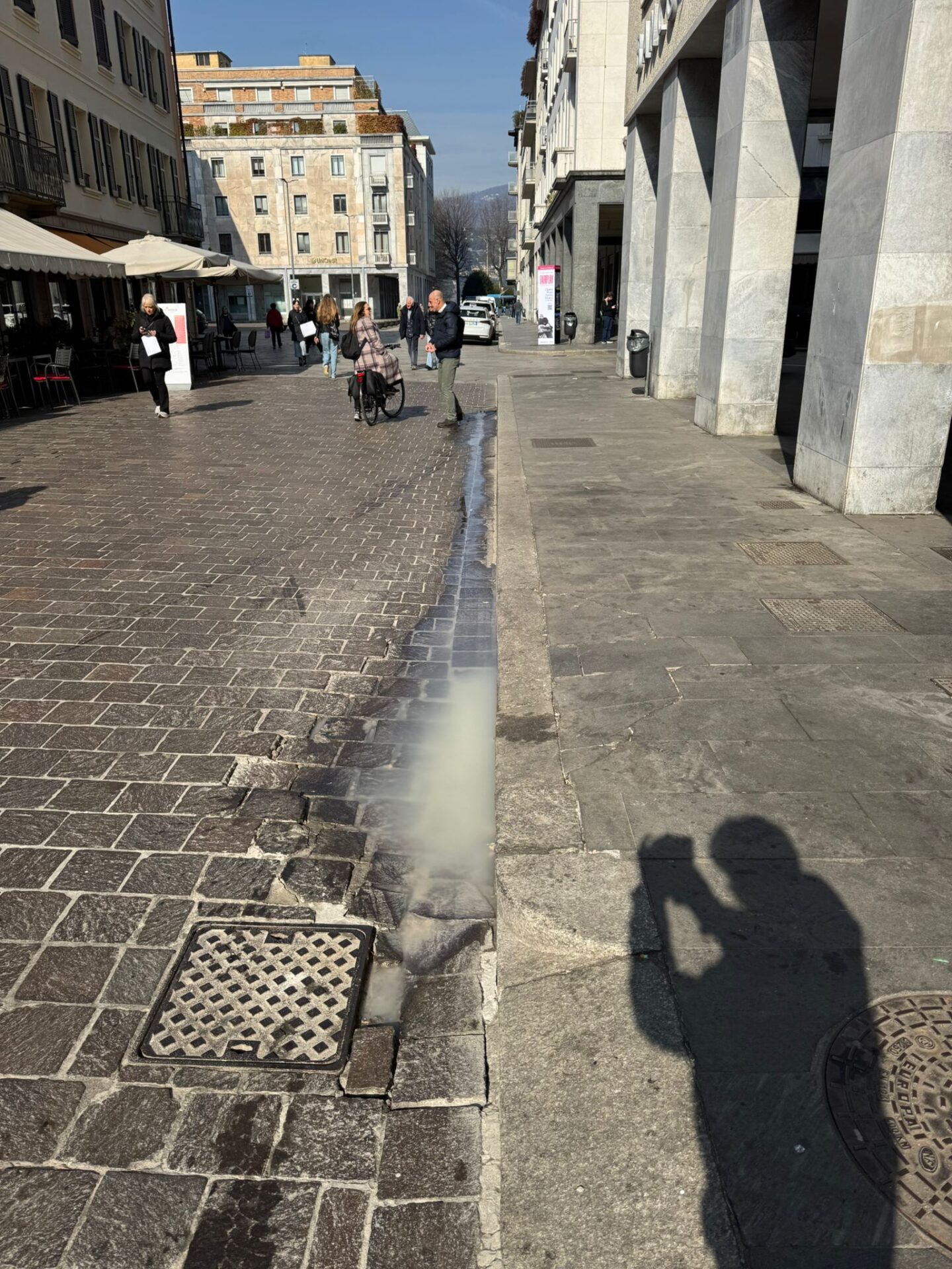 Siamo in via Boldoni, più o meno a metà strada tra l’edicola storica della zona e l’ingresso sotto i portici della Coin. Qui, come si vede bene dal breve filmato sotto, da una pozza iniziale si sviluppa una sorta di rigagnolo grigiastro che poi percorre diversi metri.