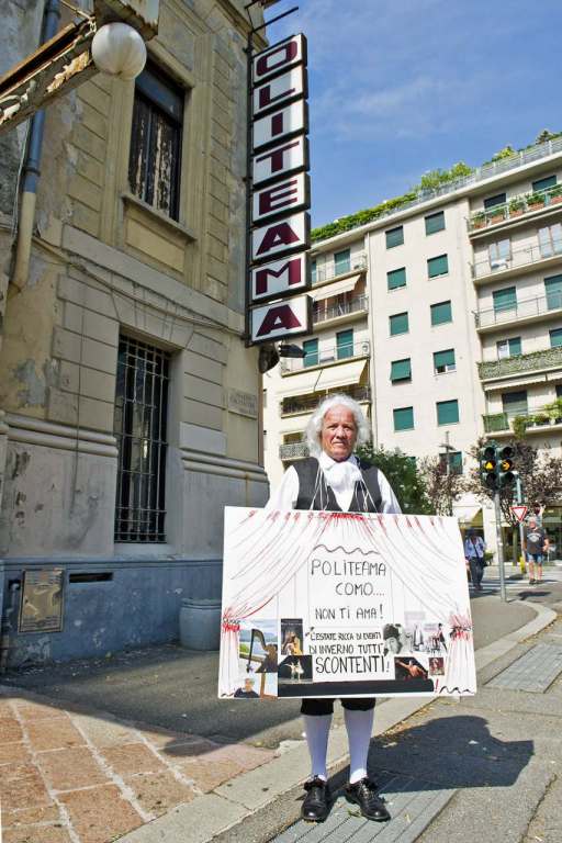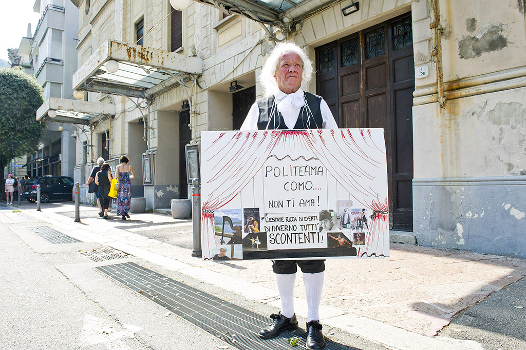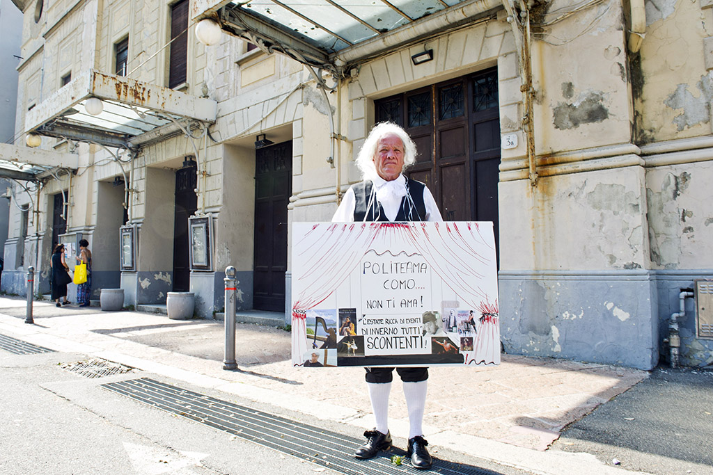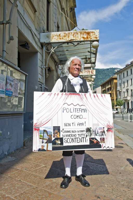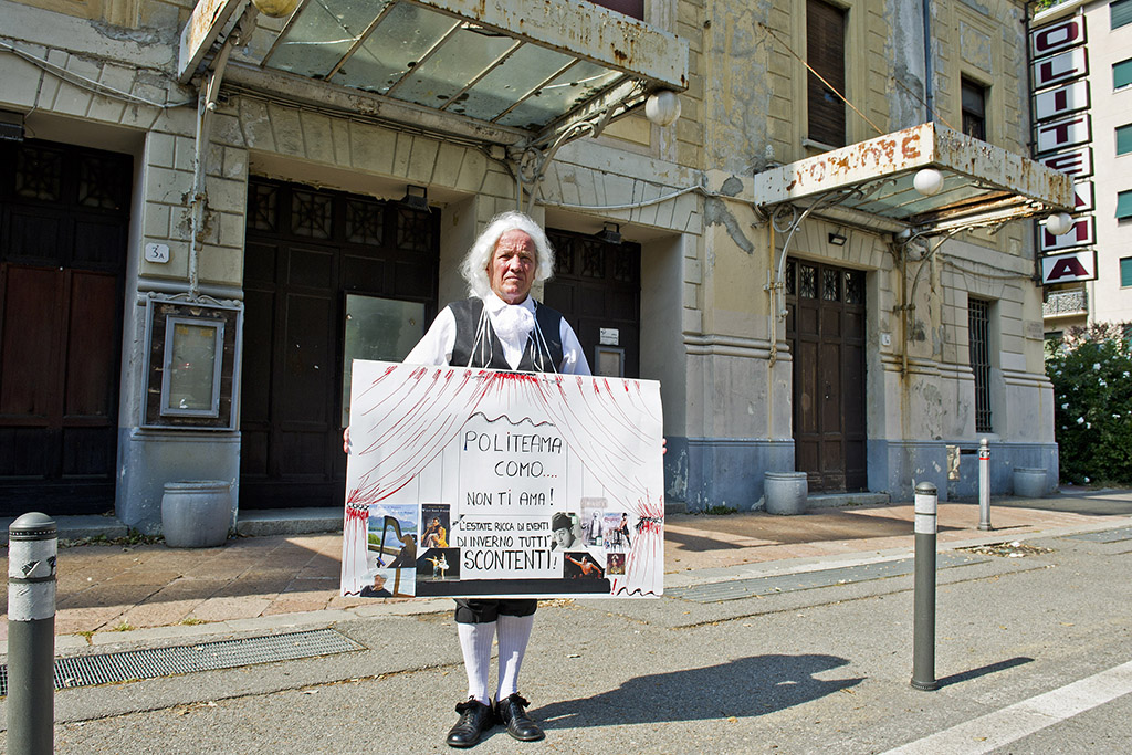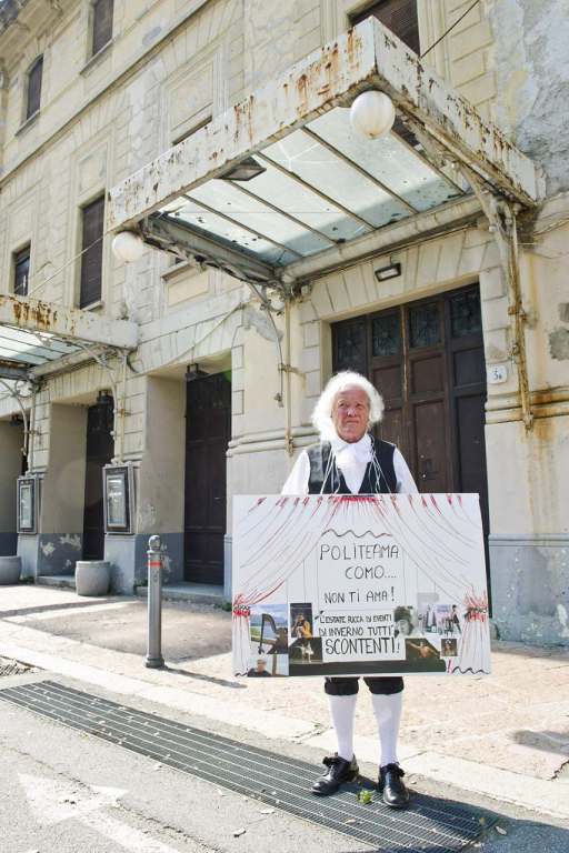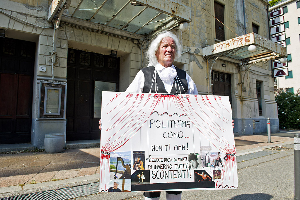 “Politeama, Como non ti ama”. Ex Cinema Politeama, alle 16 di un rovente giovedì 2 agosto, Pierangelo Butti fa la sua comparsa travestito da maschera teatrale: doppiopetto nero, parrucca bianca e al collo un cartellone con la scritta accusatoria.