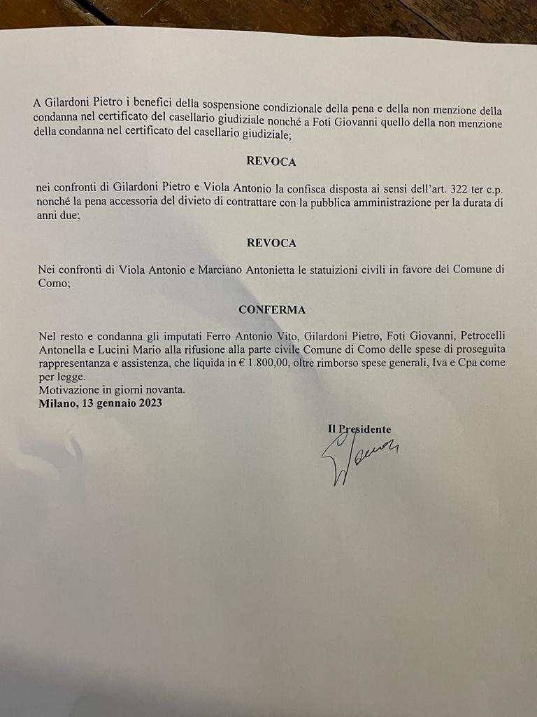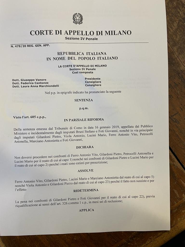 Quanto disposto in giornata dalla Corte d’Appello di Milano è l’insieme di alcune prescrizioni sopraggiunte, a cui si vanno ad aggiungere delle decisioni di non colpevolezza perchè “il fatto non sussiste”. Confermate invece due condanne per “rivelazione di segreto d’ufficio” e sono quelle contestate all’ex dirigente comunale Pietro Gilardoni, condannato in primo grado a 4 anni e all’imprenditore Giovanni Foti. Per loro condanne ridotte a 6 mesi. Le motivazioni della sentenza arriveranno tra 90 giorni.