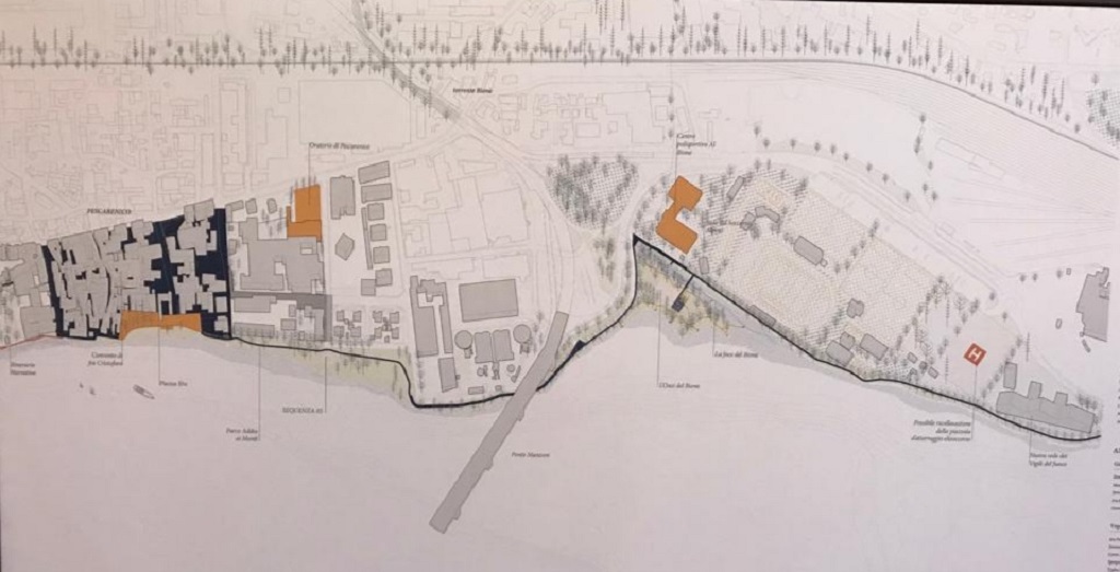 10 km totali dalle Caviate a Rivabella rivisti in chiave naturalistica e culturale con due piscine su piattaforme galleggianti alimentate con acqua di lago appositamente filtrata nella zona della Malpensata, un’area dedicata a eventi e cinema all’aperto, una piazza digradante verso l’acqua con giardino acquatico, una passeggiata pedonale, la pista ciclabile, spazio per i tavolini di locali e ristoranti e strada con velocità massima di 30 km/h per privilegiare la mobilità lenta.