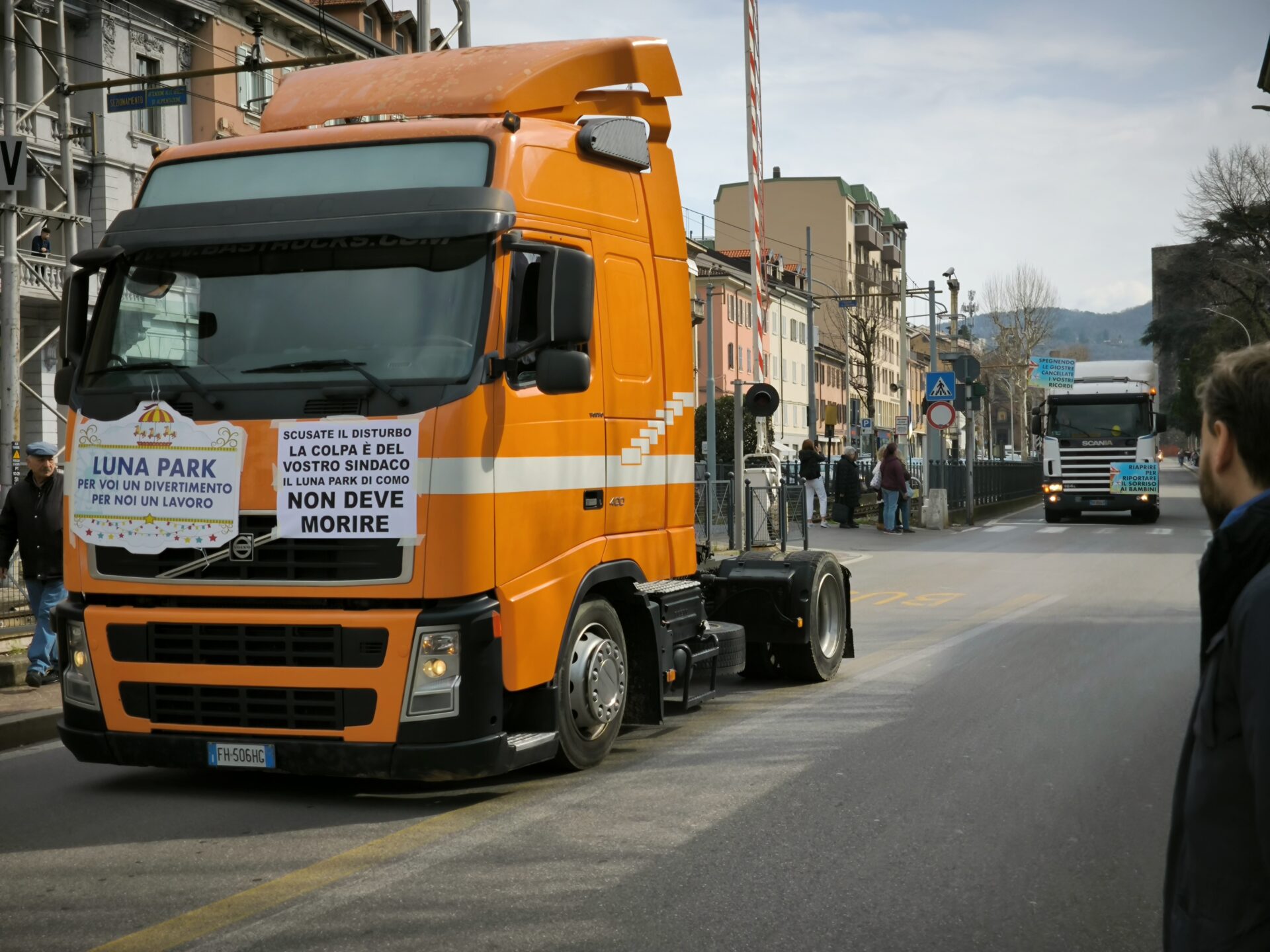 Sui mezzi diversi cartelli, in particolare uno recita: “Scusate il disturbo, la colpa è del vostro sindaco. Il luna park di Como non deve morire”.