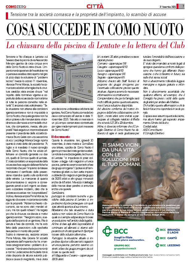 Subito è intervenuta Alte Groane Srl società proprietaria dell’impianto che ha smentisce categoricamente i problemi di sicurezza: “Non è vero che la piscina non è a norma. La decisione di chiuderla non è stata disposta da alcuna autorità pubblica a causa di irregolarità, ma è stata una decisione unilaterale e arbitraria del gestore, Asd Como Nuoto, come da loro stessi comunicato all’utenza in data 11 novembre 2025. Tale atto si inserisce in un più ampio contenzioso contrattuale per i gravi inadempimenti posti in essere da Como Nuoto”.