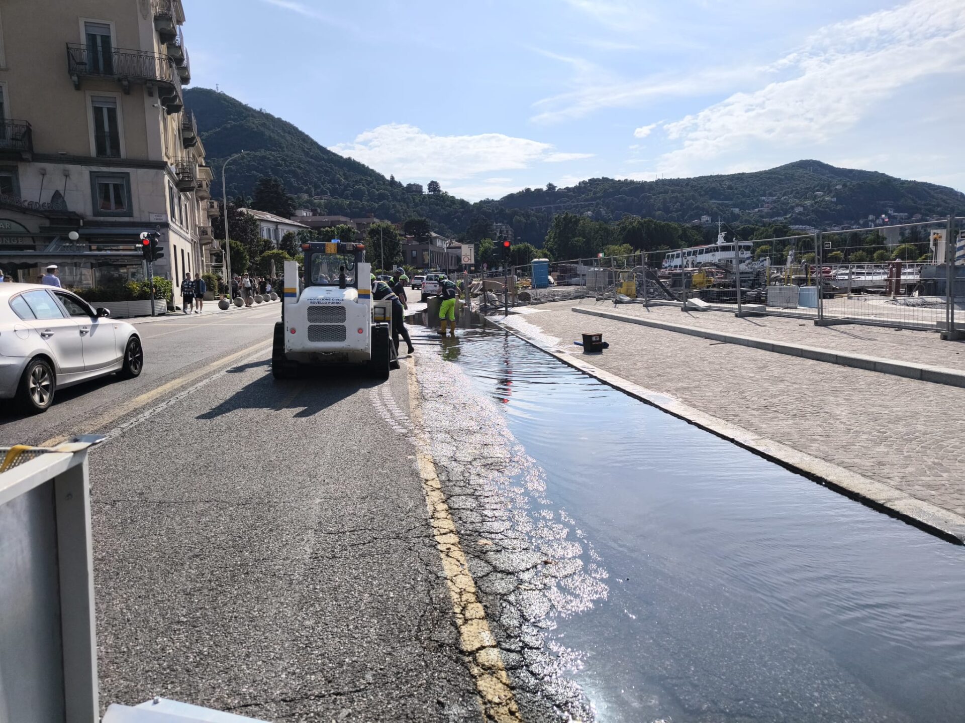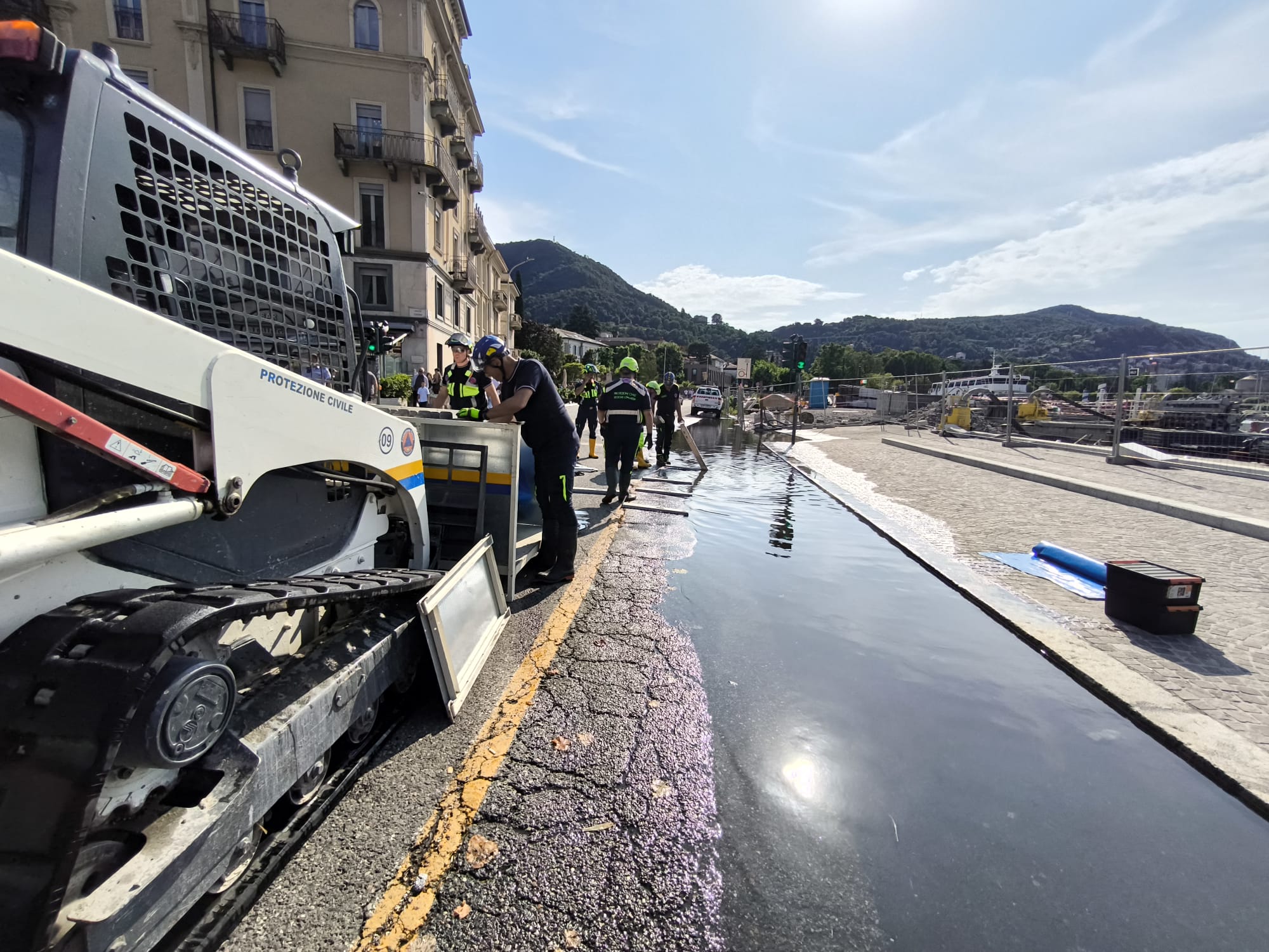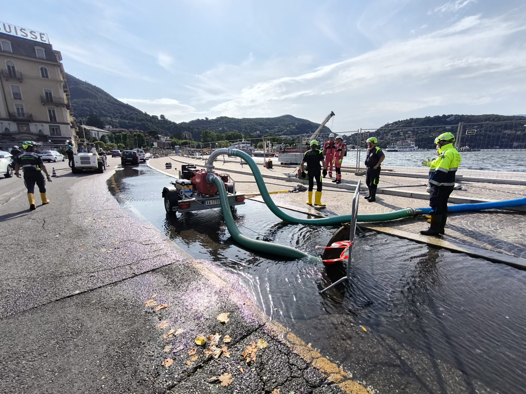 Alle 17.30 il macchinario era già in funzione e le paratie mobili in fase di allestimento. Polizia locale e Protezione civile stanno lavorando con la consueta velocità e prontezza. Tra poche ore il lago dovrebbe uscire.