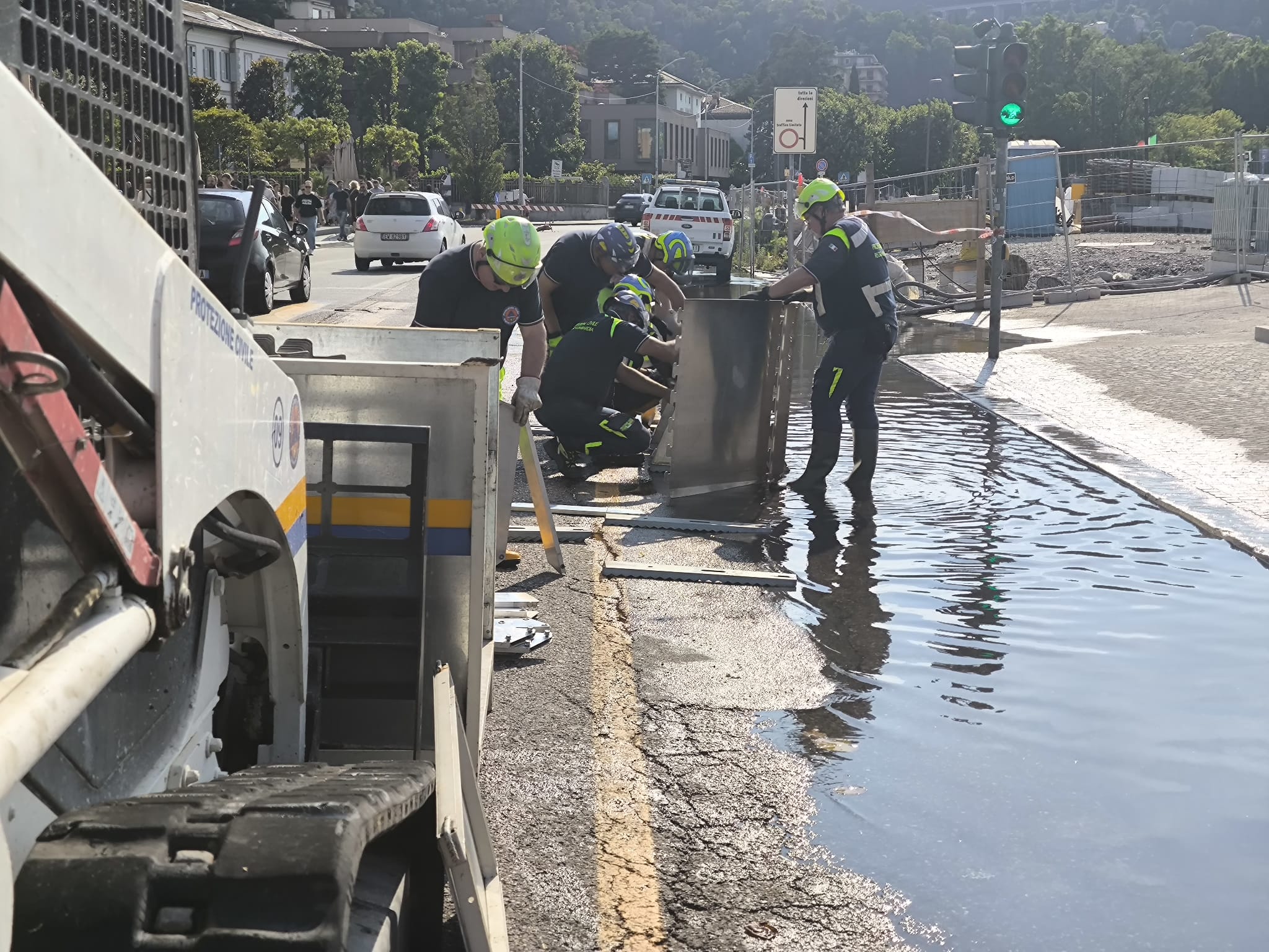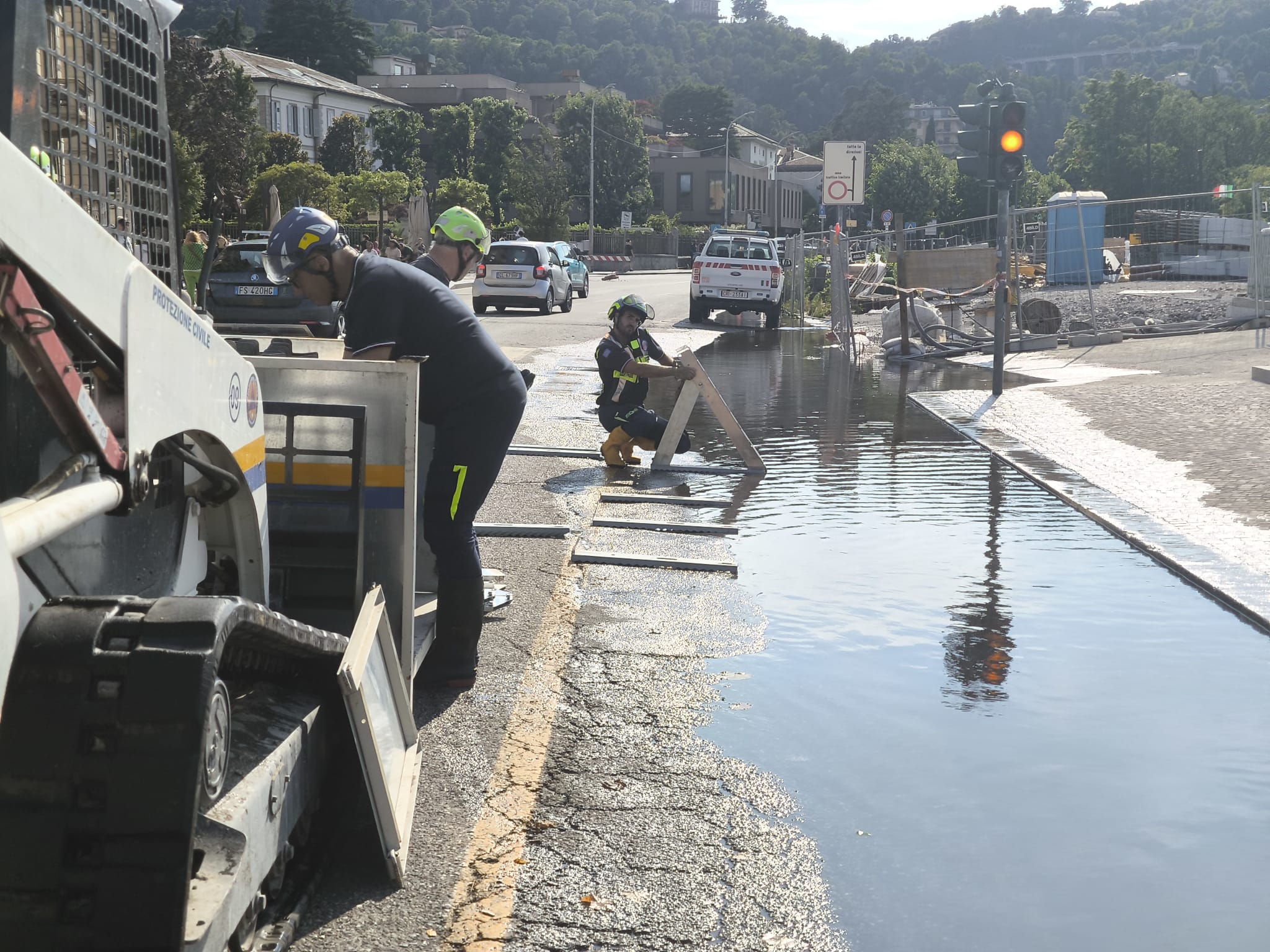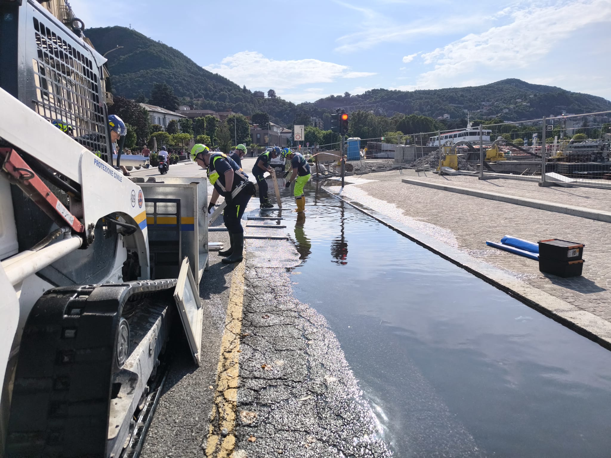 Alle 17.30 il macchinario era già in funzione e le paratie mobili in fase di allestimento. Polizia locale e Protezione civile stanno lavorando con la consueta velocità e prontezza. Tra poche ore il lago dovrebbe uscire.