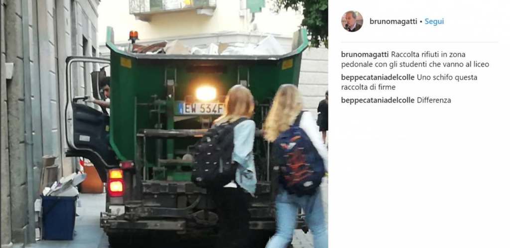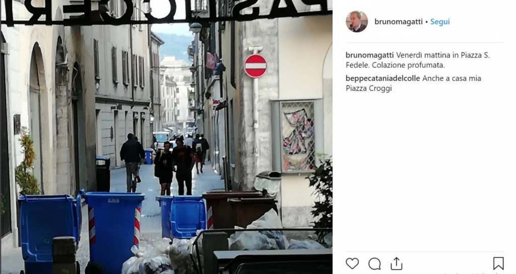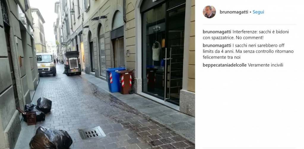 Ironia della sorte, tramite Instagram è stato l’ex assessore all’Ambiente, Bruno Magatti, a punzecchiare Galli con una serie di foto e post di sacchi in centro all’ora della colazione.