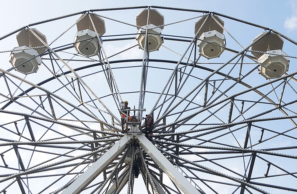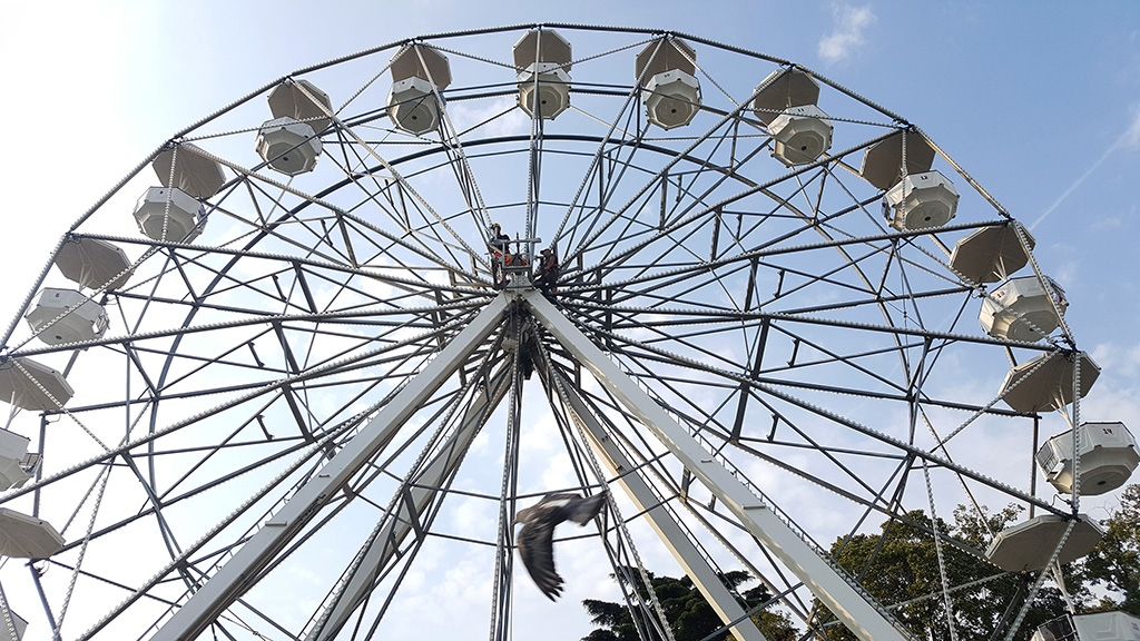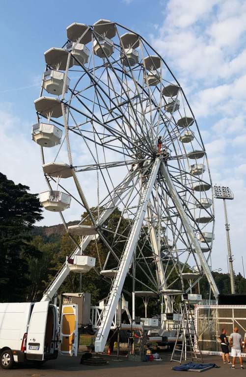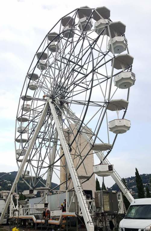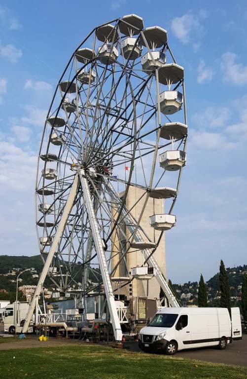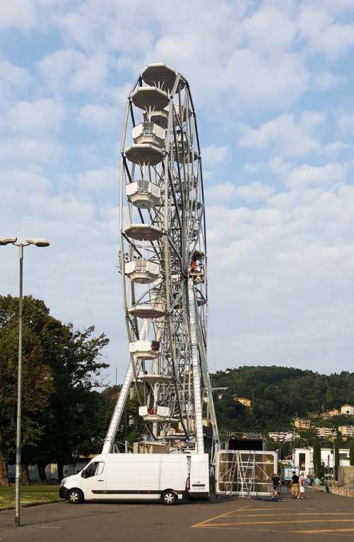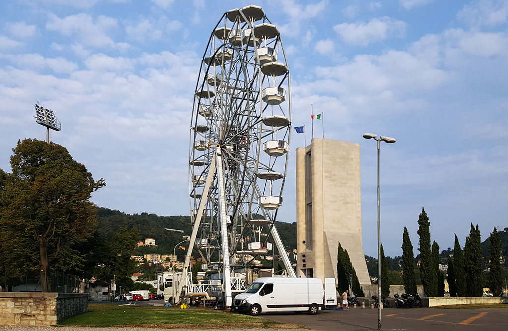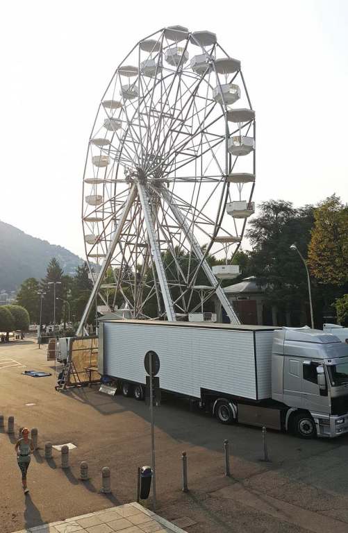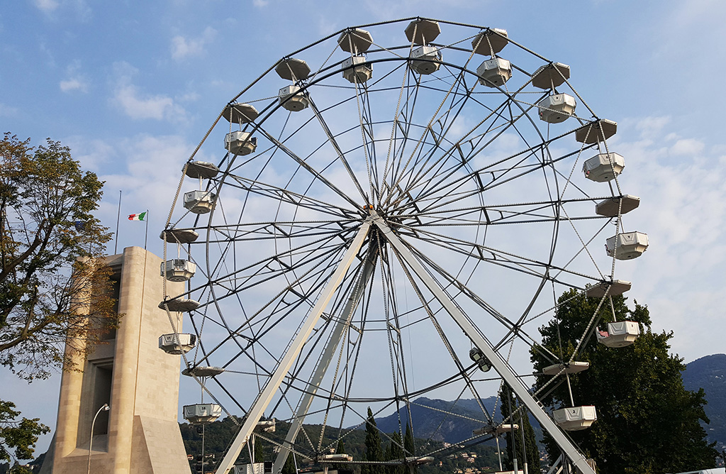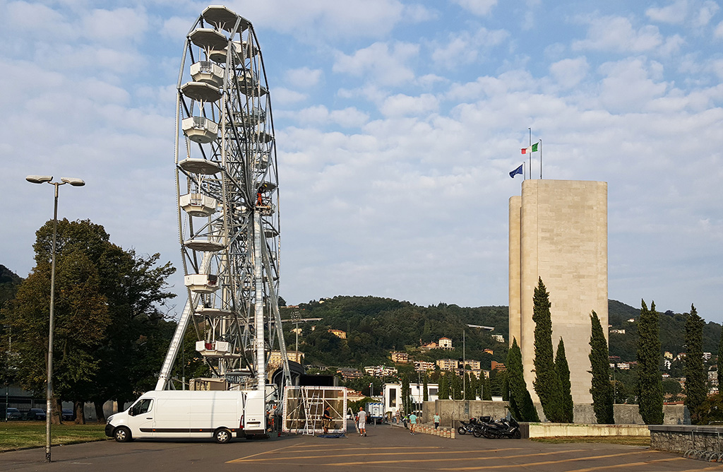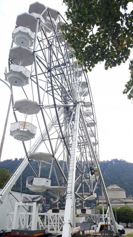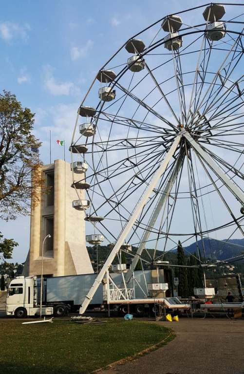 Operai attivi per allestire l’annunciata ruota panoramica che dal 26 agosto al 16 settembre aprirà i battenti ai giardini a lago, il mega cerchio, gestito dall’azienda Antonella Musso di Novara, è alto 25 metri e occuperà un’area di 144 metri quadri nella zona asfaltata di viale Puecher a destra del Monumento ai caduti, verso il Tempio Voltiano. Tassa di occupazione del suolo di 840 euro e una cauzione di 2000.