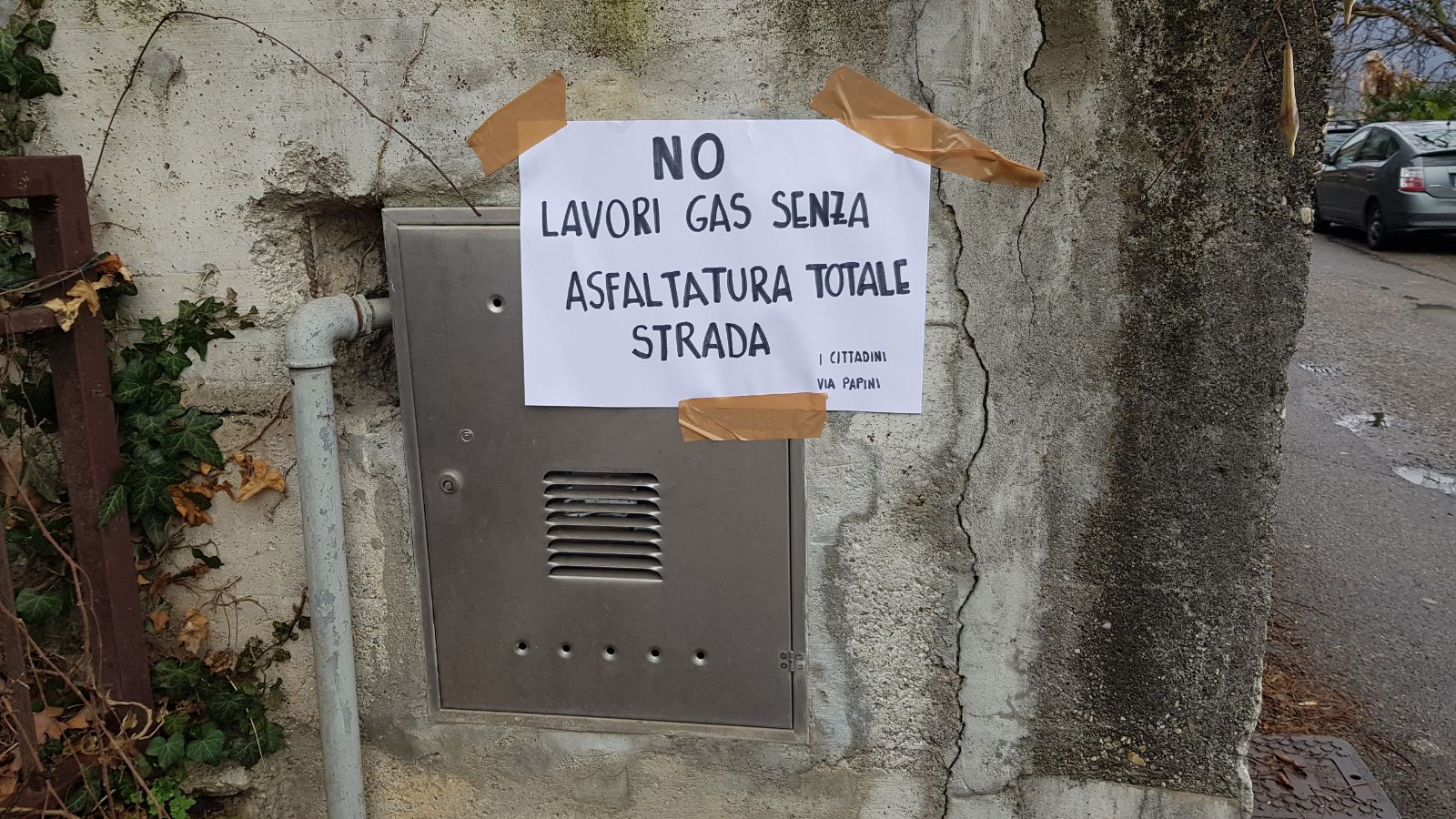 “A mali estremi…”. Il clima in via Papini a Sagnino è tesissimo. I residenti oggi sono scesi in strada con striscioni e manifesti. “Da anni – spiegano – vengono effettuati continui lavori da parte delle aziende del gas, la strada viene costantemente aperta e richiusa, il risultato è evidente: una lunga serie di buche coperte male o non coperte del tutto, dove noi residenti rischiamo di cadere, farci male o in giorni di pioggia essere completamente lavati”. In effetti, pezza dopo pezza, l’asfalto si presenta in pessime condizioni, l’intera via è flagellata da buche e piccole voragini.