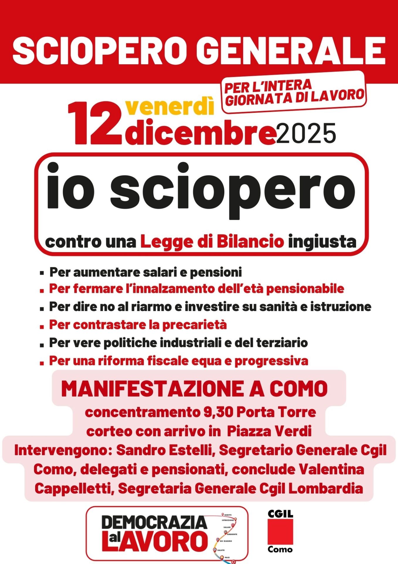 La Cgil di Como spiega in una nota le modalità e i contenuti dello sciopero generale di venerdì 12 dicembre a Como: