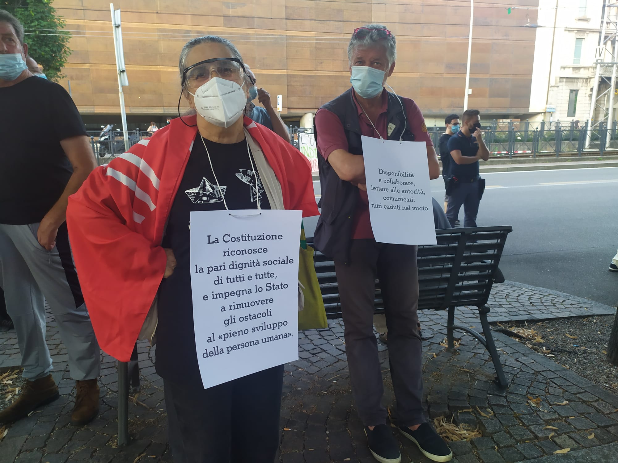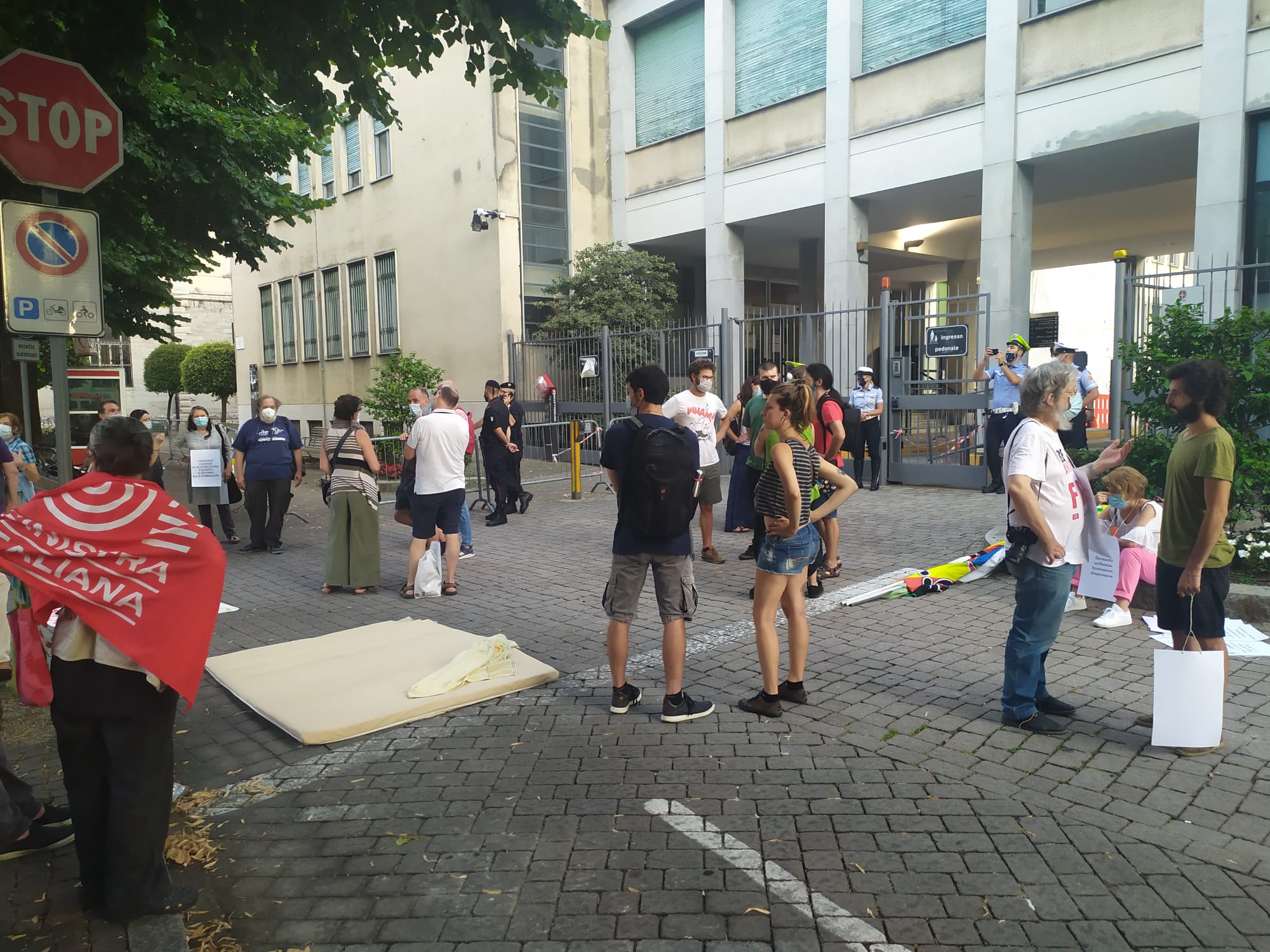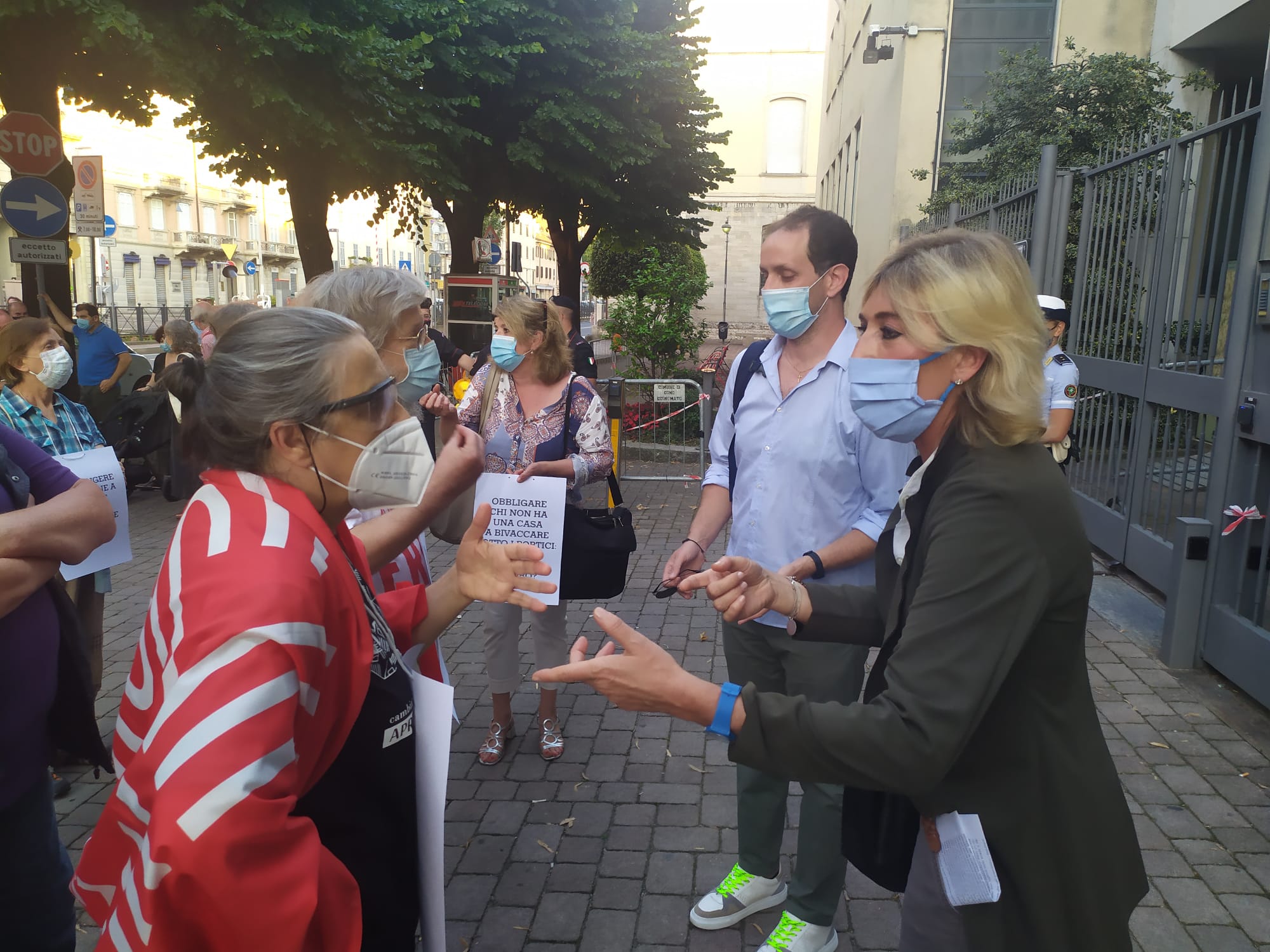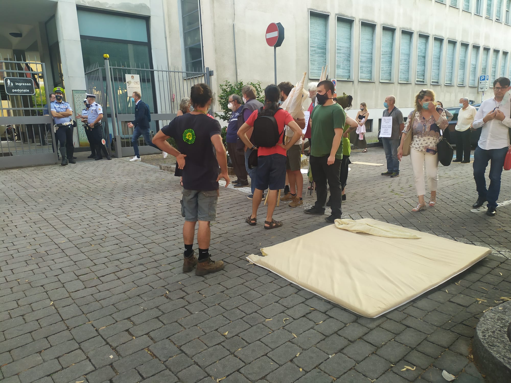 Il gruppo di manifestanti ha intercettato i consiglieri in entrata, in particolare quelli del Pd che però, dopo qualche parola, sono entrati nel Cernezzi.