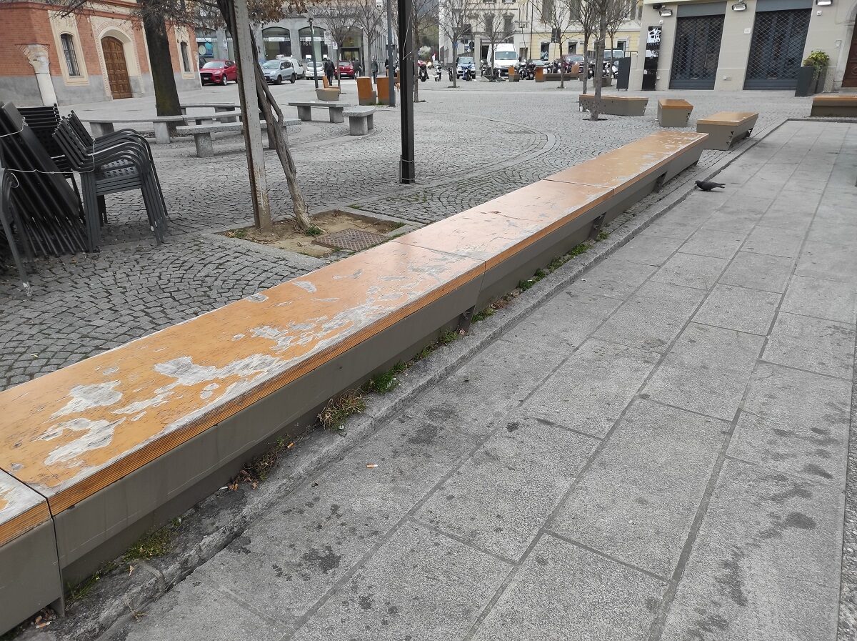 Non brillano per cura (e neppure per design) le lunghe panche di piazza Volta: il legno sta cominciando a lasciarsi andare e assomigliano sempre più alla cassapanca ultra decennale della zia.