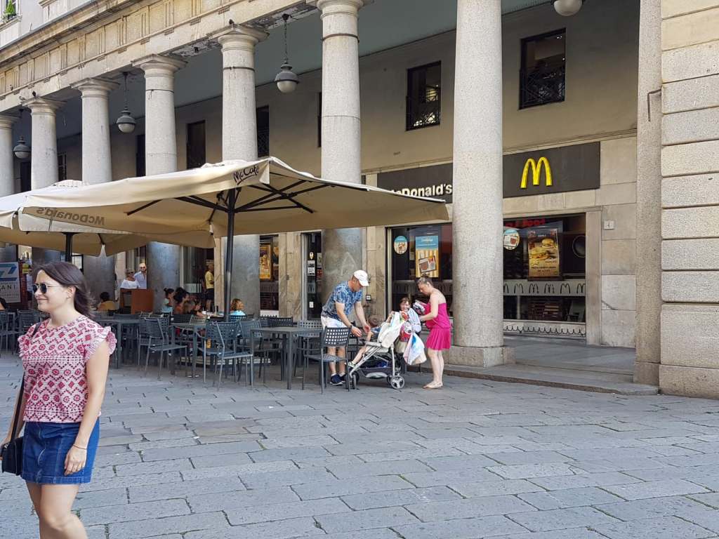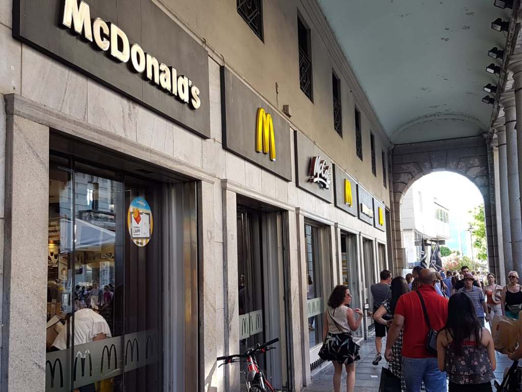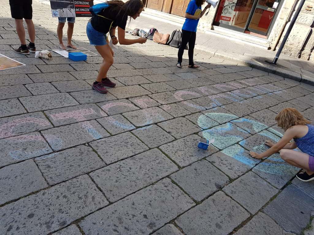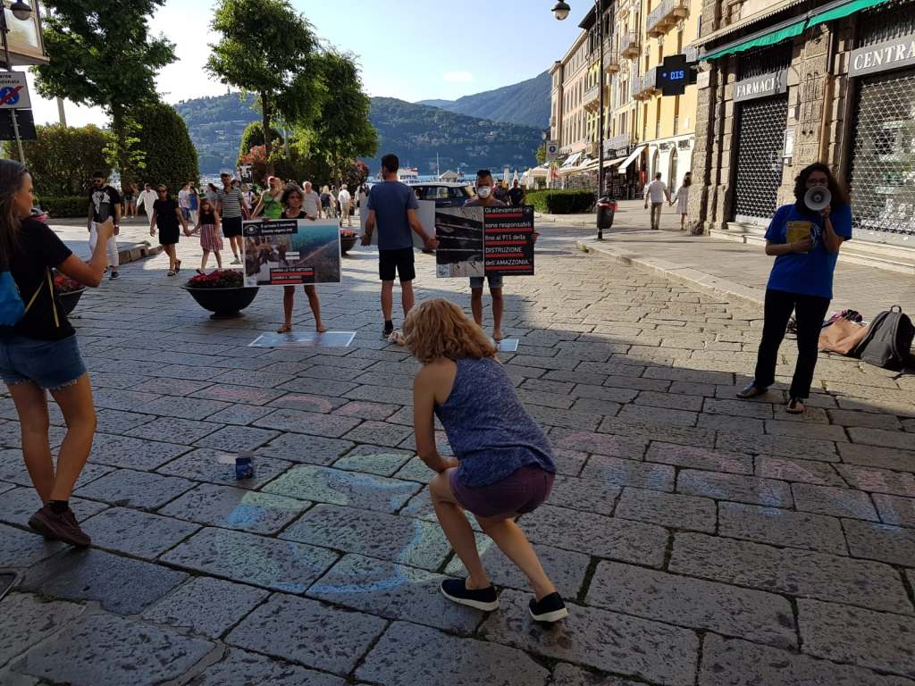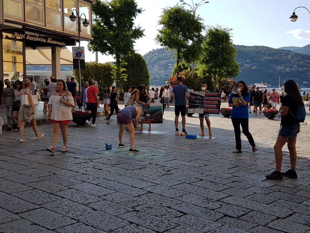 “Non è un caso che manifestiamo qui – spiega un’altra volontaria – siamo a un passo da Mc Donald’s e sapete bene quanta carne vendono. Poi non ci lamentiamo della deforestazione dell’Amazzonia”.