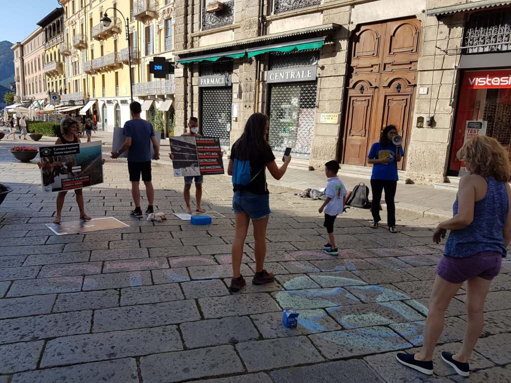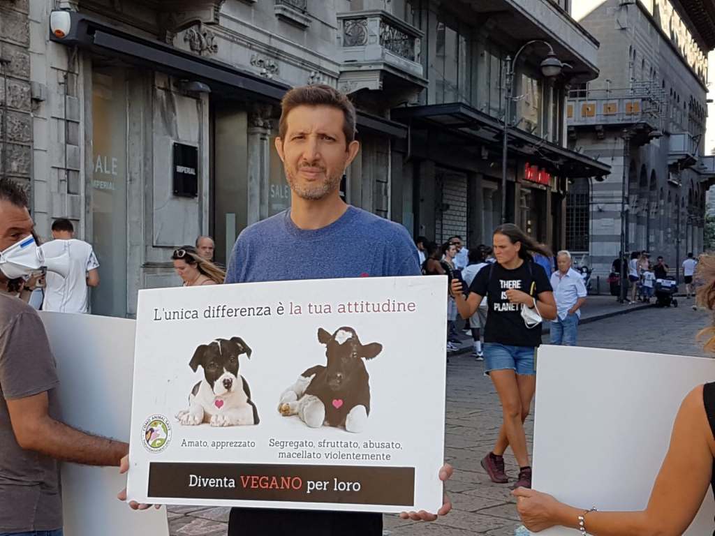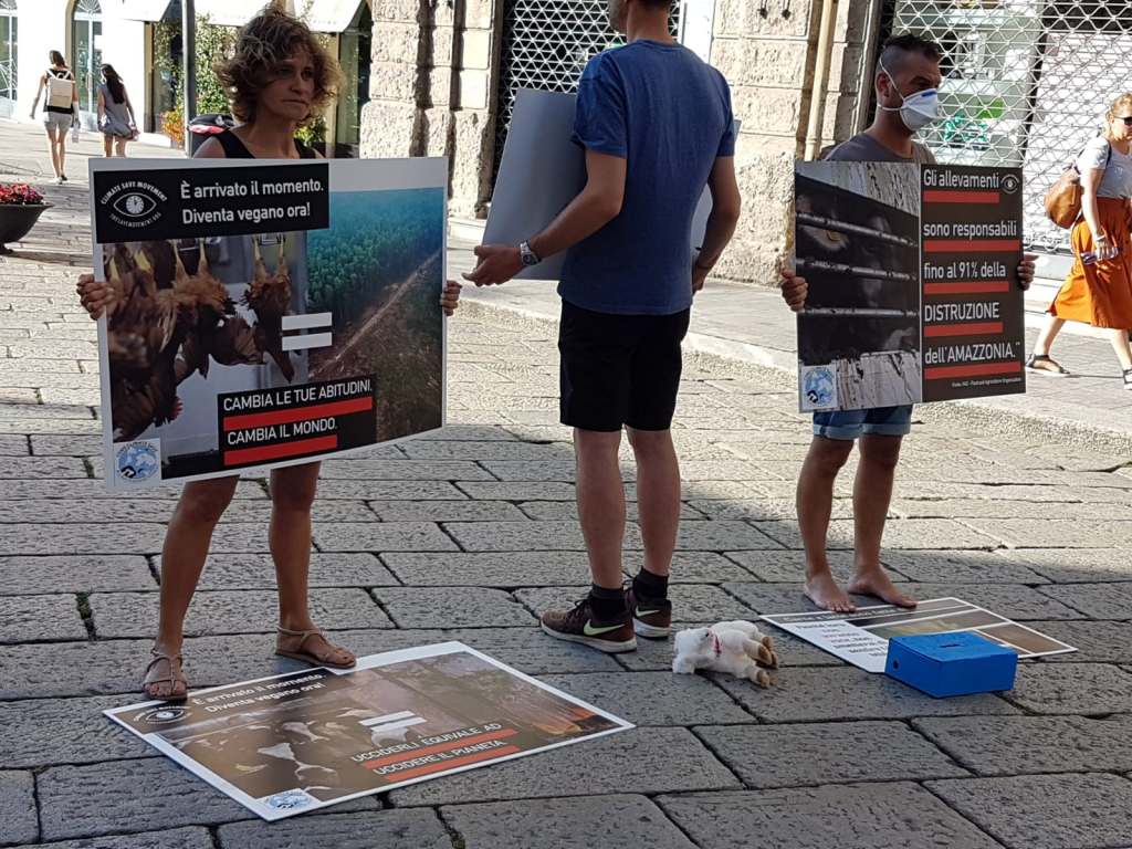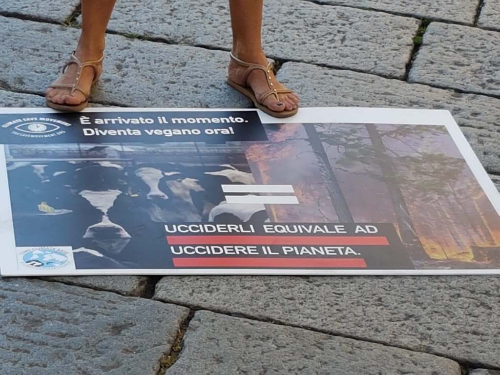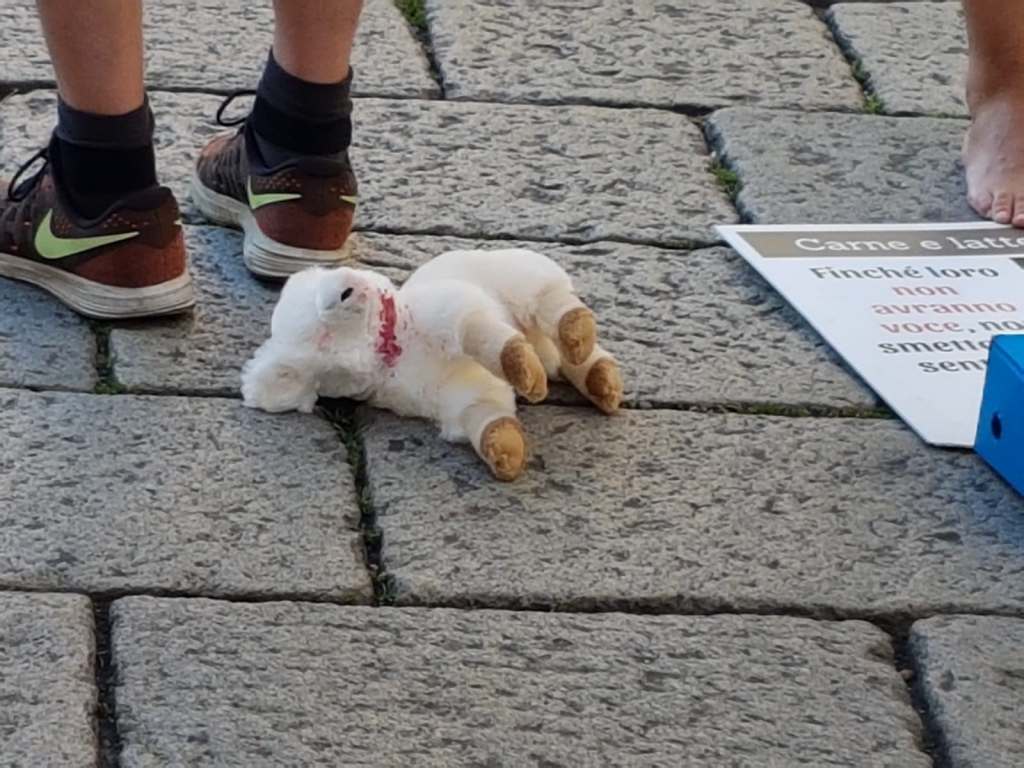 “E’ arrivato il momento, diventa vegano ora”. Cartelli di protesta, megafono per snocciolare numeri e impatto ambientale degli allevamenti animali e della produzione di carne, piccolo peluche insanguinato a terra.
