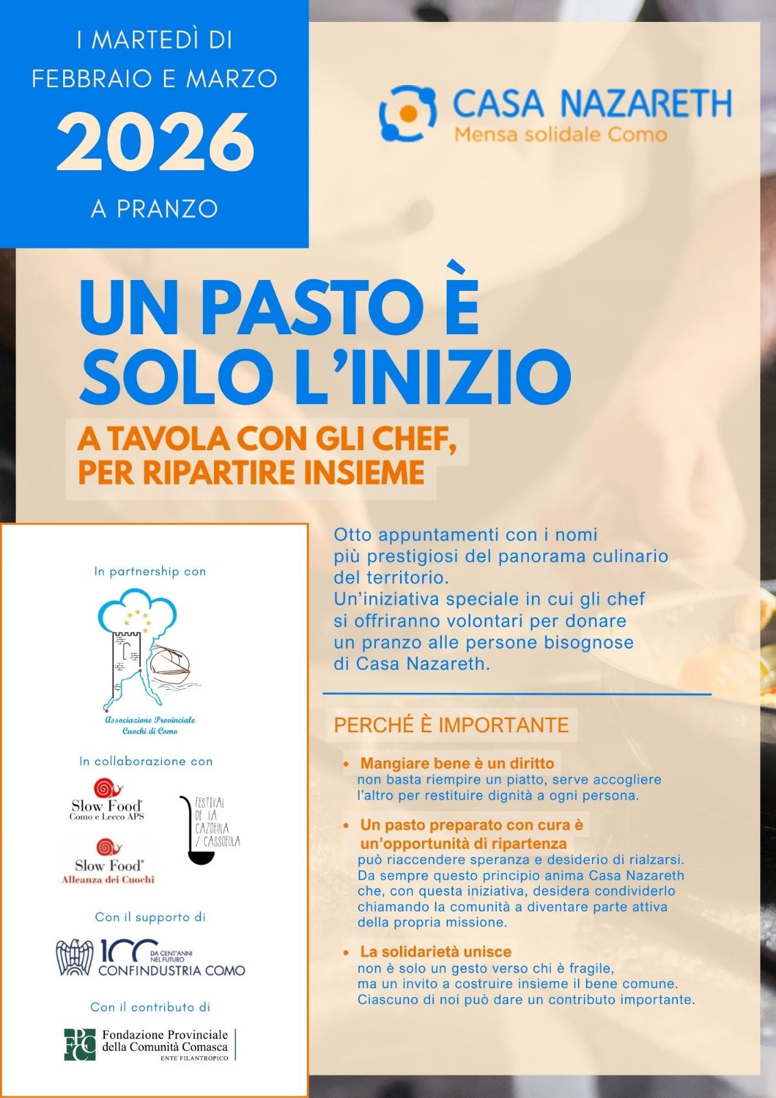 “Un pasto è solo l’inizio: a tavola con gli Chef” nasce dalla collaborazione inedita tra Casa Nazareth, che con 75.190 pasti serviti nel 2025 rappresenta un presidio fondamentale per chi è più fragile, e l’Associazione Provinciale Cuochi di Como, con il supporto di Confindustria Como e il contributo di Fondazione Provinciale della Comunità Comasca onlus.