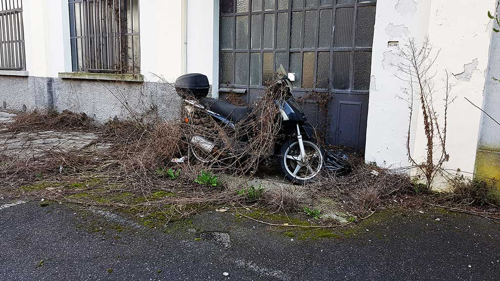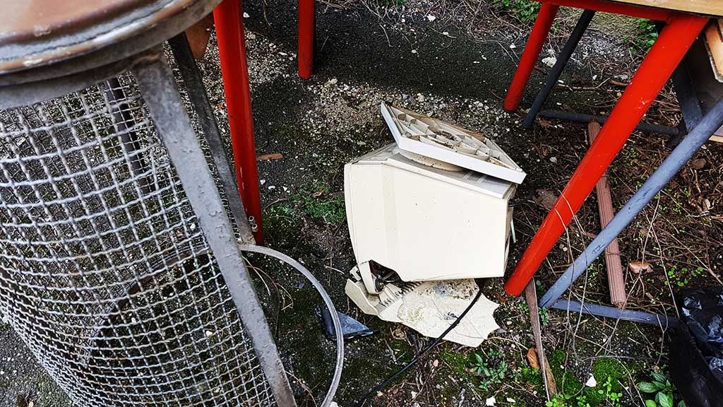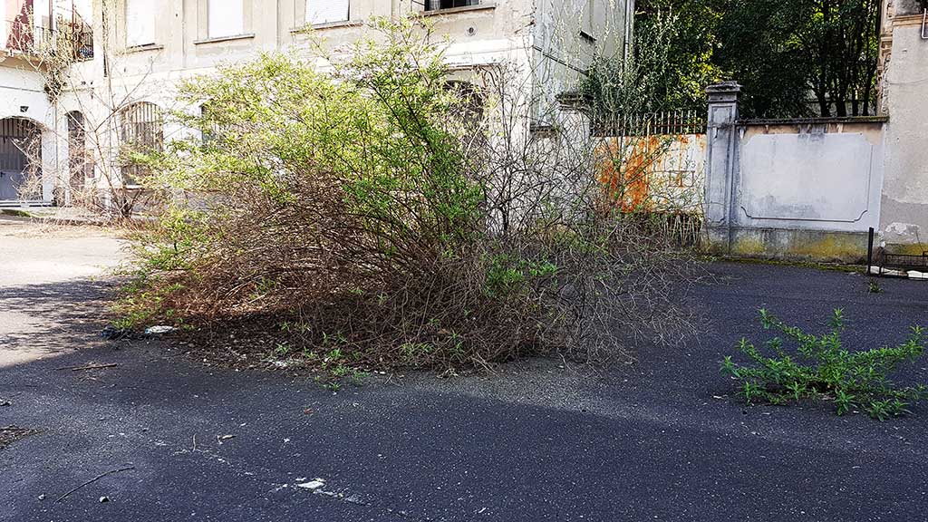 La traccia umana è ancora evidente, tra le colonne. Qualche accenno di vita dietro una finestra ma le epoche si alternano, il tempo passa, le radici spaccano l’asfalto, i rami diventano tappeto e parete. Intorno è abbandono, rifiuto, polvere. Un’auto sfondata, un computer – antenato nobile dei nostri device che internet nemmeno se lo sognava – è sfracellato sotto i vecchi banchi della scuola media.