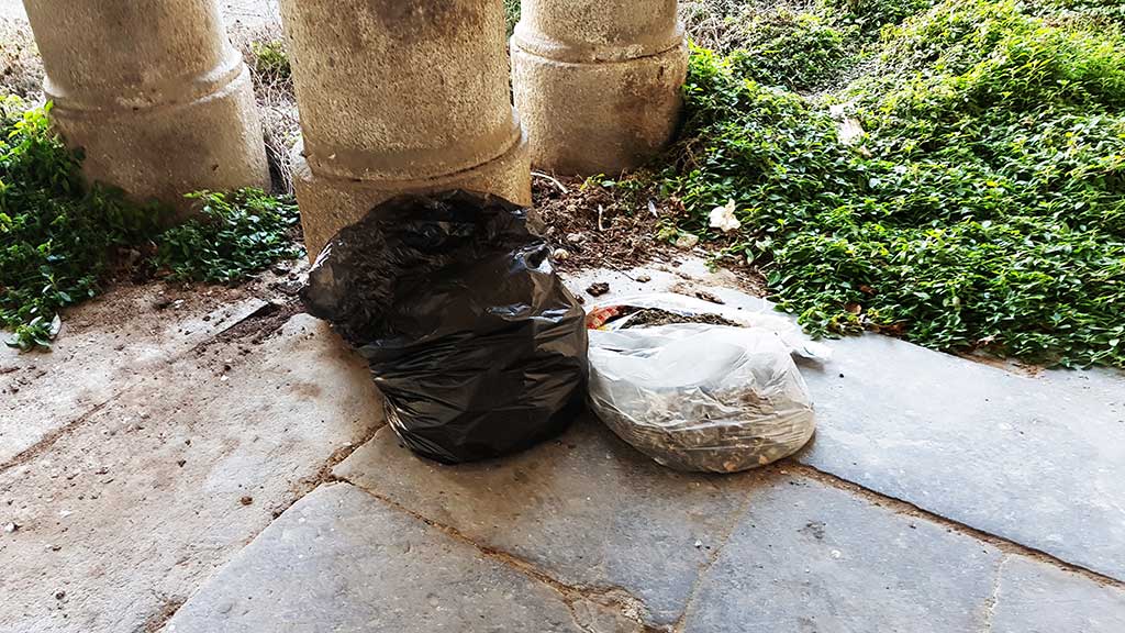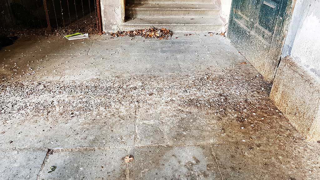 Piante ovunque, escrementi di piccioni, computer, mobili, rifiuti. Lo stato di degrado è completo