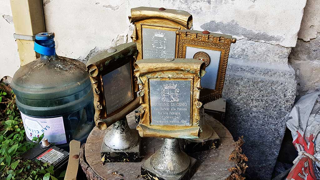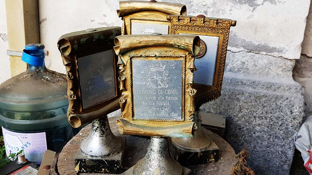 Quattro trofei appoggiati su un tavolo masticato dalle stagioni si affacciano, sfrontati, ossidati, quasi ridanciani sulla corte della vecchia media Baden Powell. “Assessorato Servizi alla Persona e alla Famiglia. Corrida, Ferragosto insieme 1998”, racconta la serigrafia ancora leggibile. Uno sberleffo involontario, forse cercato, che narra lontani fasti perduti.
