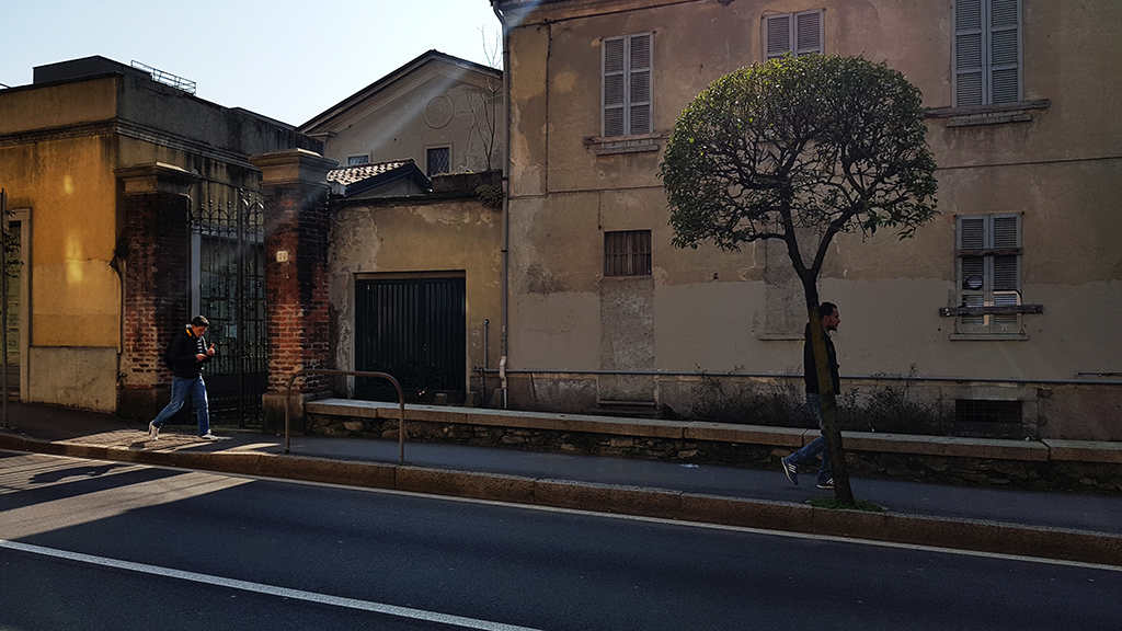 E’ raggiungibile solo la prima corte, arroccata dietro un portone verde, blindato tutto il giorno. Così per restituire quanto resta dell’architettura, dei fregi e dell’arte ci voleva un artista. Bruno Saba. Radice profondamente romana, comasco dal 1974, formato fra le tele di Guttuso, Montarini e Purificato, poi vicino a Rho, Radice e Galli. Lo studio di Saba esiste e resiste fra le pareti che si sbriciolano e le volte che sostengono a fatica il peso della fatiscenza. Si fa nocchiero, Virgilio il pittore comasco, accompagnandoci oltre il confine fra forme che, per drammatico significato, paiono evocare gli stessi panorami onirici eppur tremendamente umani della sua pittura.