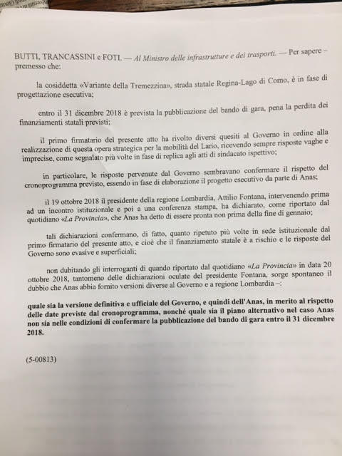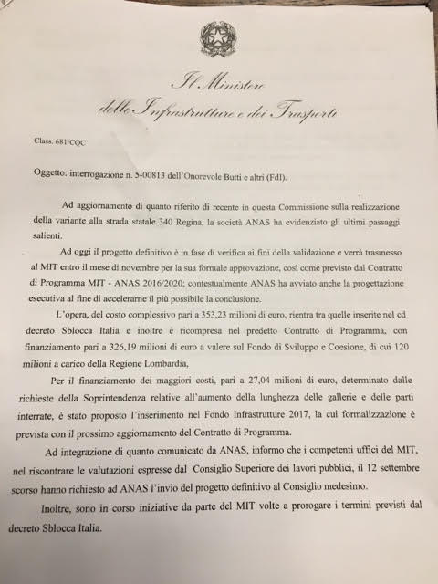 Con questa frase chiara e fumosa al tempo stesso, il ministro Danilo Toninelli ha risposto all’interrogazione del deputato comasco di Fratelli d’Italia, Alessio Butti, sul futuro della Variante delle Tremezzina. Opera su cui, come noto, pende una ghigliottina non di poco conto: ovvero il 31 dicembre prossimo, termine ultimo (almeno a oggi) perché sia pronto il progetto esecutivo. Altrimenti, il rischio concreto che i fondi stanziati proprio dallo Sblocca Italia (210 milioni sui 353,23 complessivi) si volatilizzino nel nulla. Decretando, ovviamente, la “morte anticipata” dell’infrastruttura.