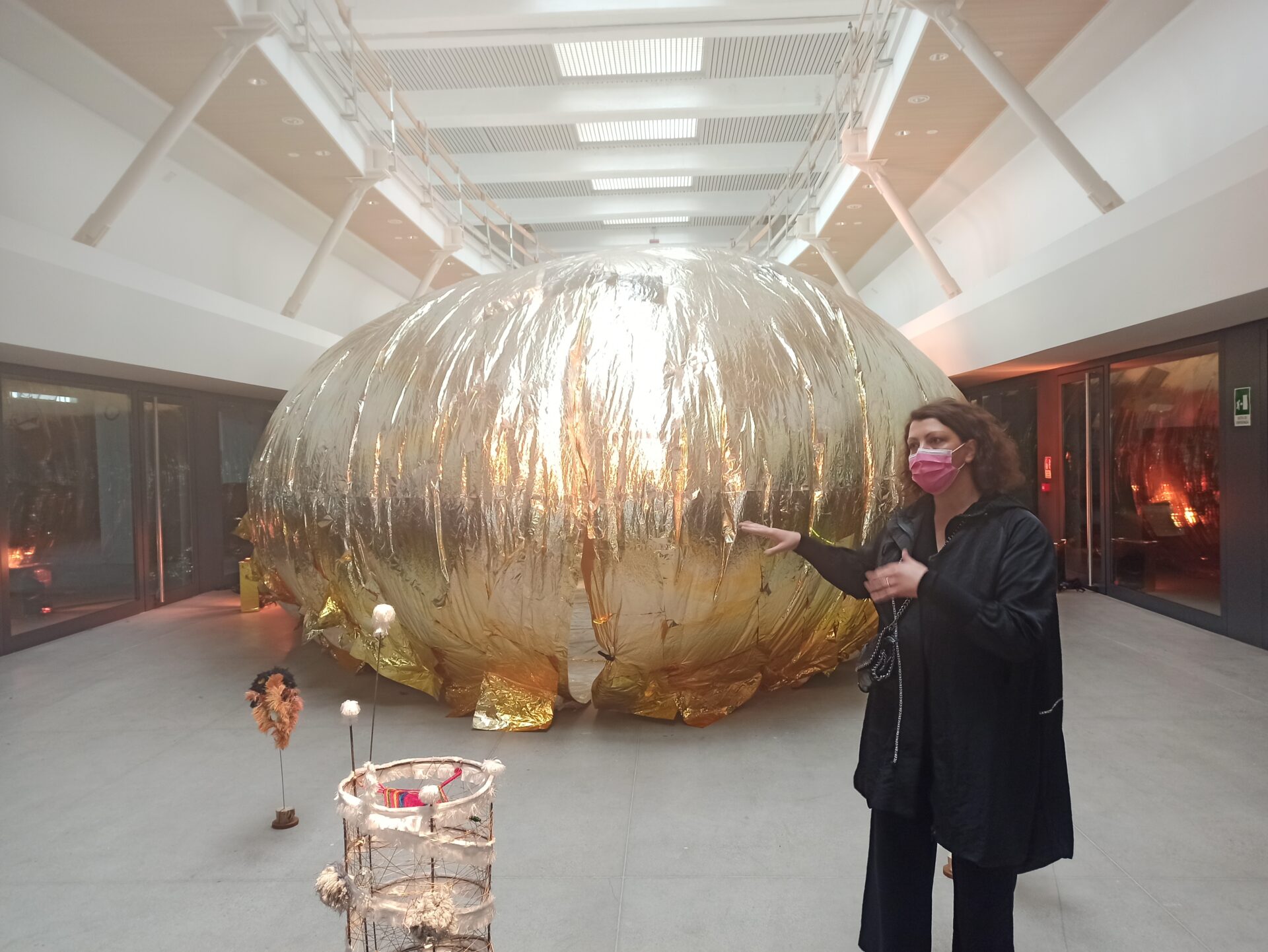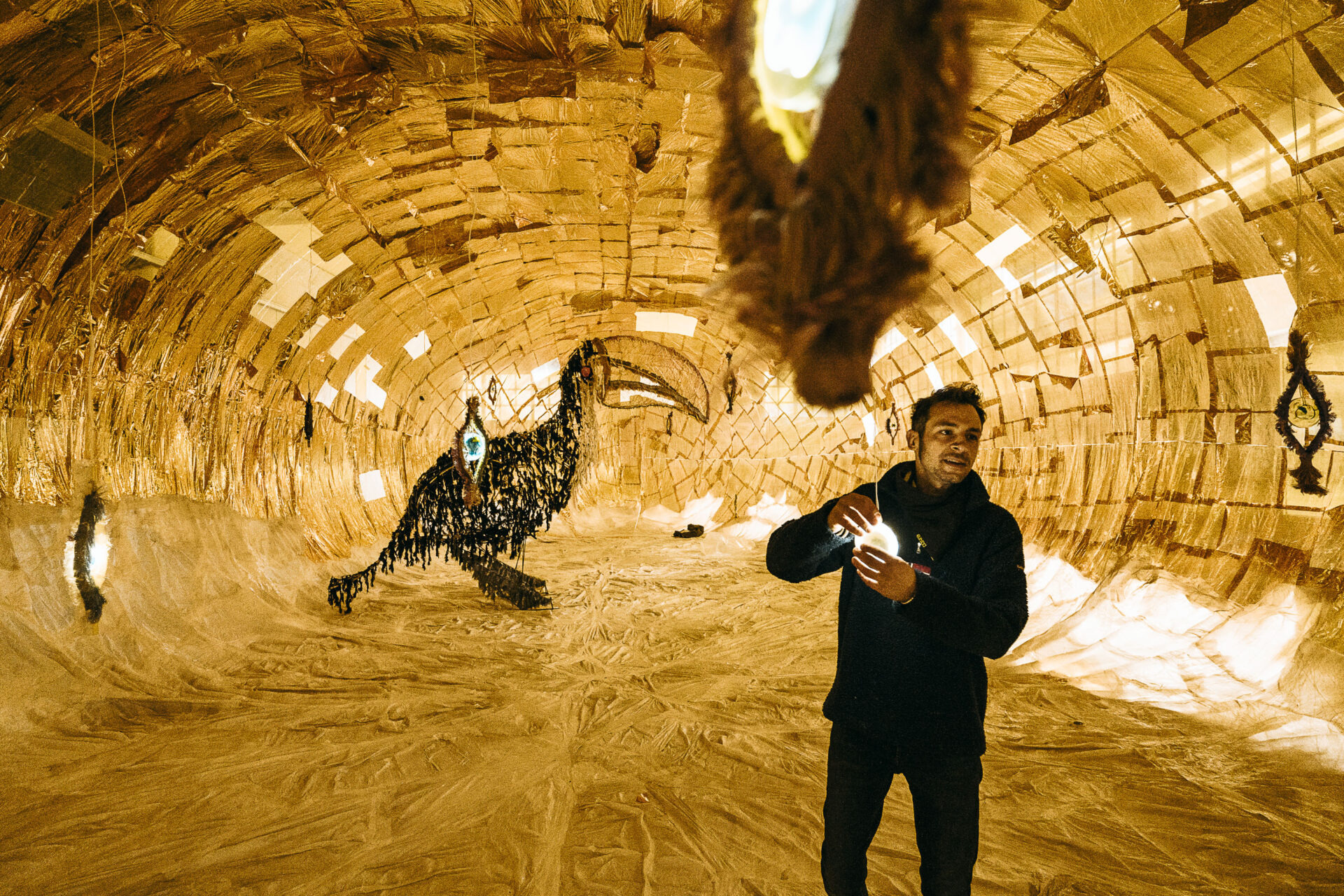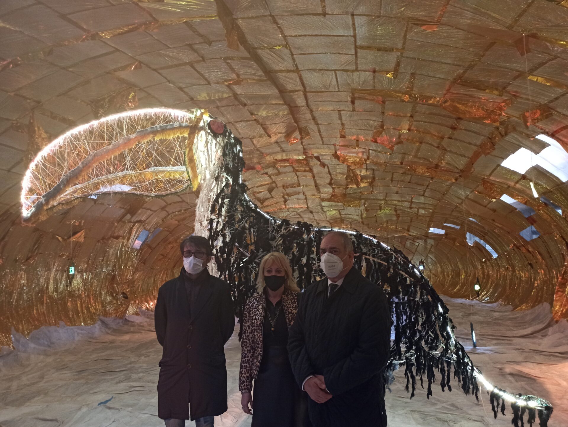 All’interno diverse installazioni e un enorme tucano con un’anima in metallo ricoperta da cimosse delle seterie Mantero e illuminata da luci a led collegate tramite un’App al battito cardiaco dell’artista che ne modifica il colore. “Sei esattamente dove dovresti essere”, questo è il titolo di questa straordinaria installazione, è il messaggio dell’artista che è nell’unico luogo in cui può stare, accanto alle sue opere. Ma è anche un messaggio che, lanciato in questo luogo bellissimo e dimenticato, deve essere un invito a riflettere su quello che può trovare spazio qui.