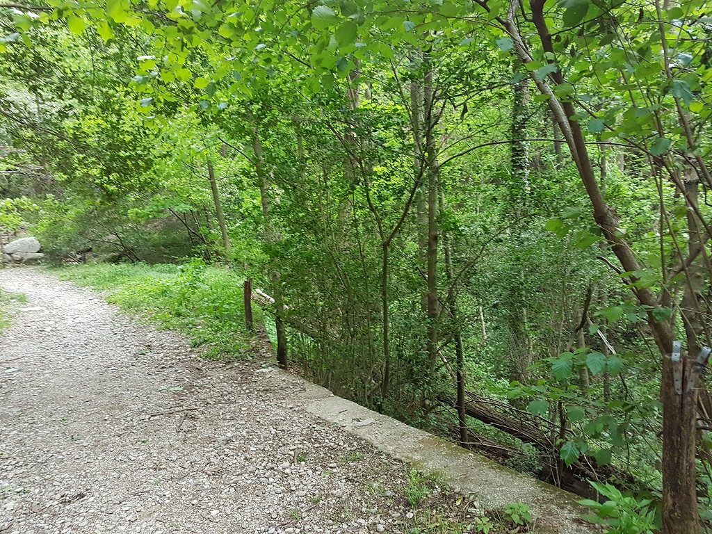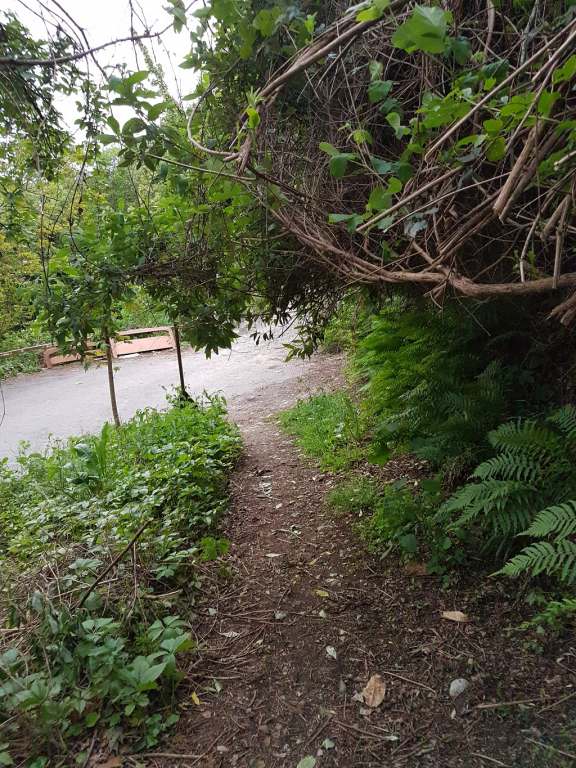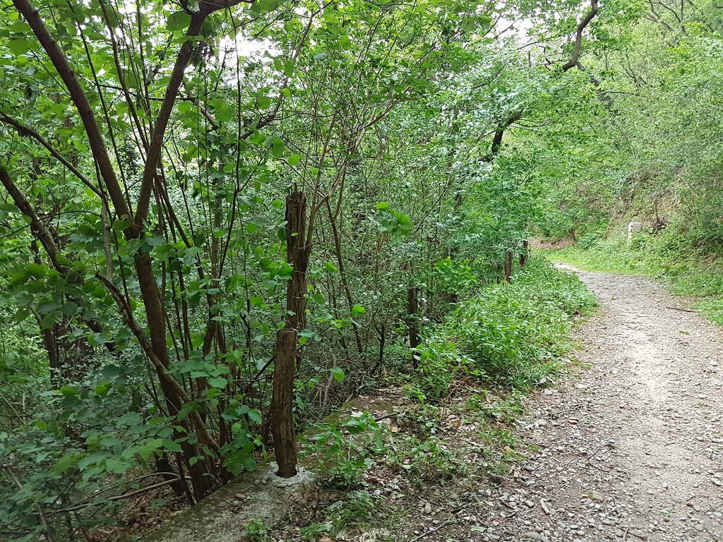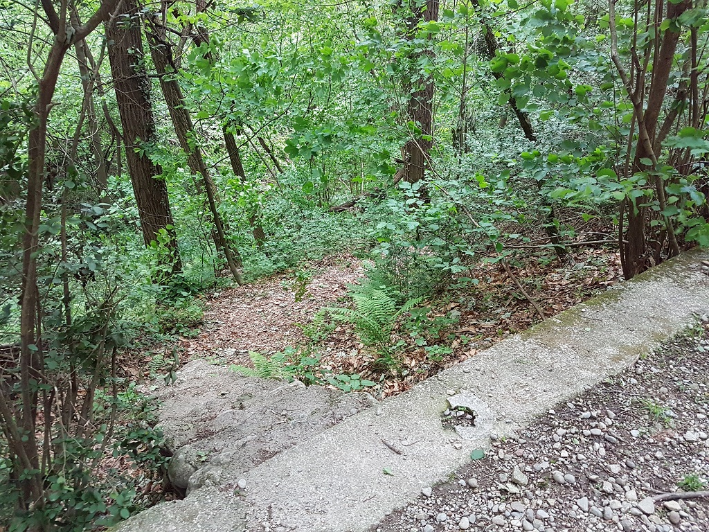 Nel tratto verso destra, invece, ovvero come detto in direzione del Parco della Rimembranza, non è accaduto praticamente niente. E dunque, dopo una cinquantina di metri di strada asfaltata che terminano contro una sbarra in ferro ci si imbatte in un pannello informativo superstite con qualche tag e circondato dalle erbacce, comincia il sentiero che si può osservare nelle foto.