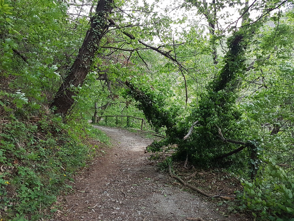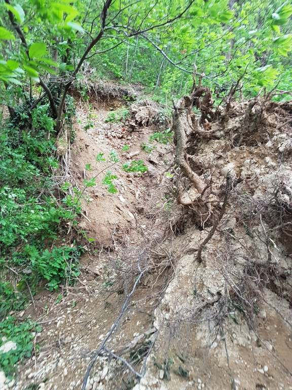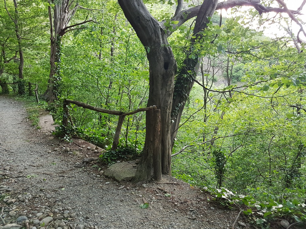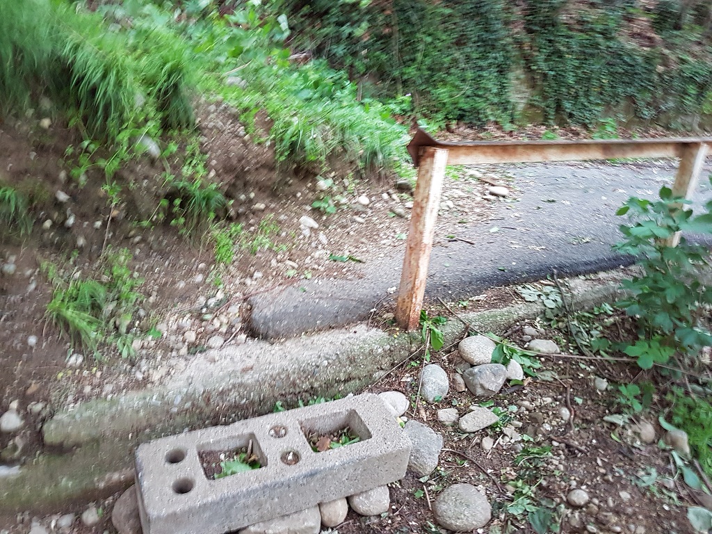A monte e a valle del sentiero spicca l’incuria: valletti di scolo dell’acqua pieni di rami e fogliame (una delle due frane fu causata da queste situazioni), scale senza più mancorrenti, staccionate rovinate, crollate, inesistenti. Per non parlare degli alberi pericolanti o caduti sul sentiero. Il grande castagno che appare a un certo punto del sentiero cadde addirittura più di un anno fa ma era rimasto coricato sul pendio qualche metro più in su. In queste ultime 2 o 3 settimane è scivolato fin sul sentiero, ostruendolo quasi del tutto.