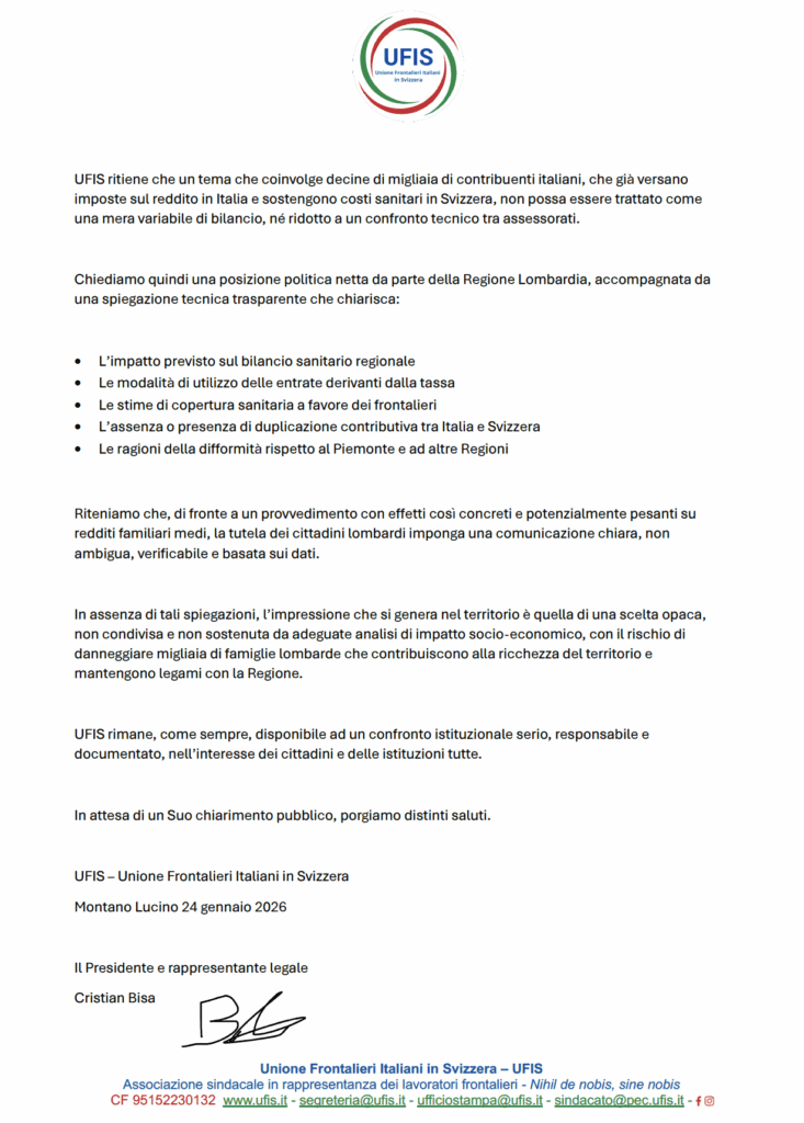 Nello specifico, l’UFIS esige dalla Regione Lombardia massima trasparenza e una solida motivazione tecnica in merito alla scelta di applicare una contribuzione sanitaria regionale ai frontalieri. Parallelamente, l’associazione ha richiesto alla Svizzera una presa di posizione ufficiale riguardante il nuovo Accordo Bilaterale Italia–Svizzera, denunciando la discriminazione già operativa tra “vecchi” e “nuovi” frontalieri .