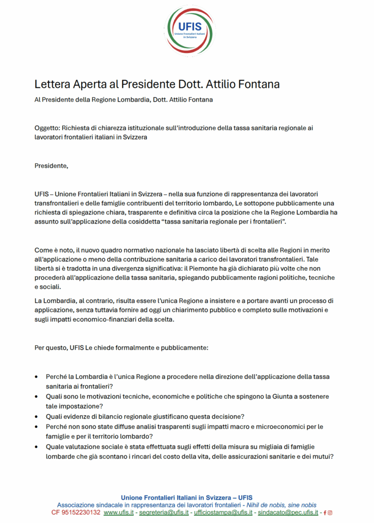 L’UFIS ha inoltrato una comunicazione formale al Presidente della Regione Lombardia, Attilio Fontana, per sollecitare la Giunta regionale a motivare la decisione di procedere verso l’applicazione della contribuzione sanitaria ai frontalieri. Si tratta di una scelta che appare isolata, poiché la Lombardia si distingue da tutte le altre regioni di confine, tra cui il Piemonte, che ha invece espresso pubblicamente la propria contrarietà alla misura.