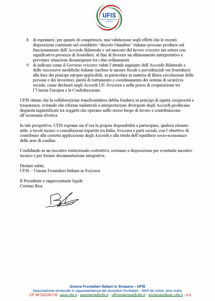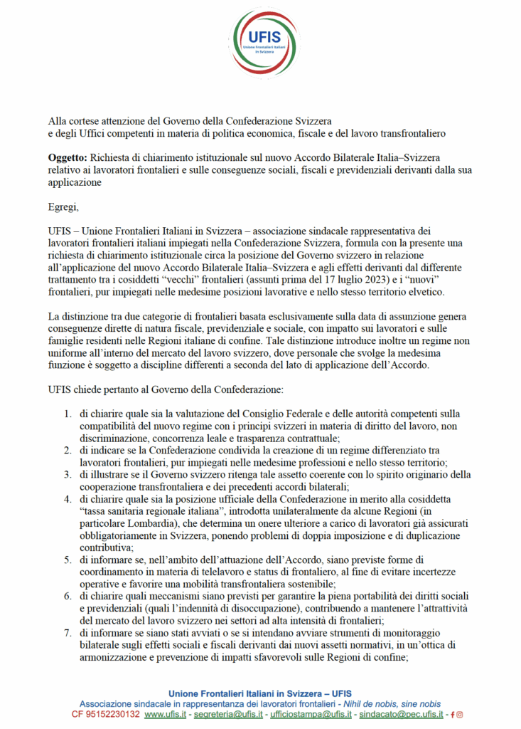 L’UFIS afferma con chiarezza che l’obiettivo non è semplicemente quello di “correggere dettagli applicativi” , ma di riconoscere che il nuovo Accordo Bilaterale ha introdotto una disparità strutturale che non può essere tollerata. Per questa ragione, l’associazione chiede formalmente che:
